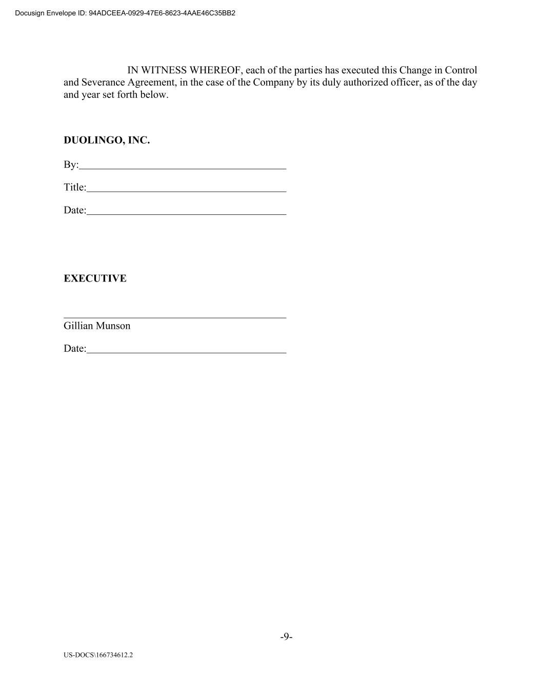 -9- US-DOCS\166734612.2 IN WITNESS WHEREOF, each of the parties has executed this Change in Control and Severance Agreement, in the case of the Company by its duly authorized officer, as of the day and year set forth below. DUOLINGO, INC. By: Title: Date: EXECUTIVE Gillian Munson Date: Docusign Envelope ID: 94ADCEEA-0929-47E6-8623-4AAE46C35BB2