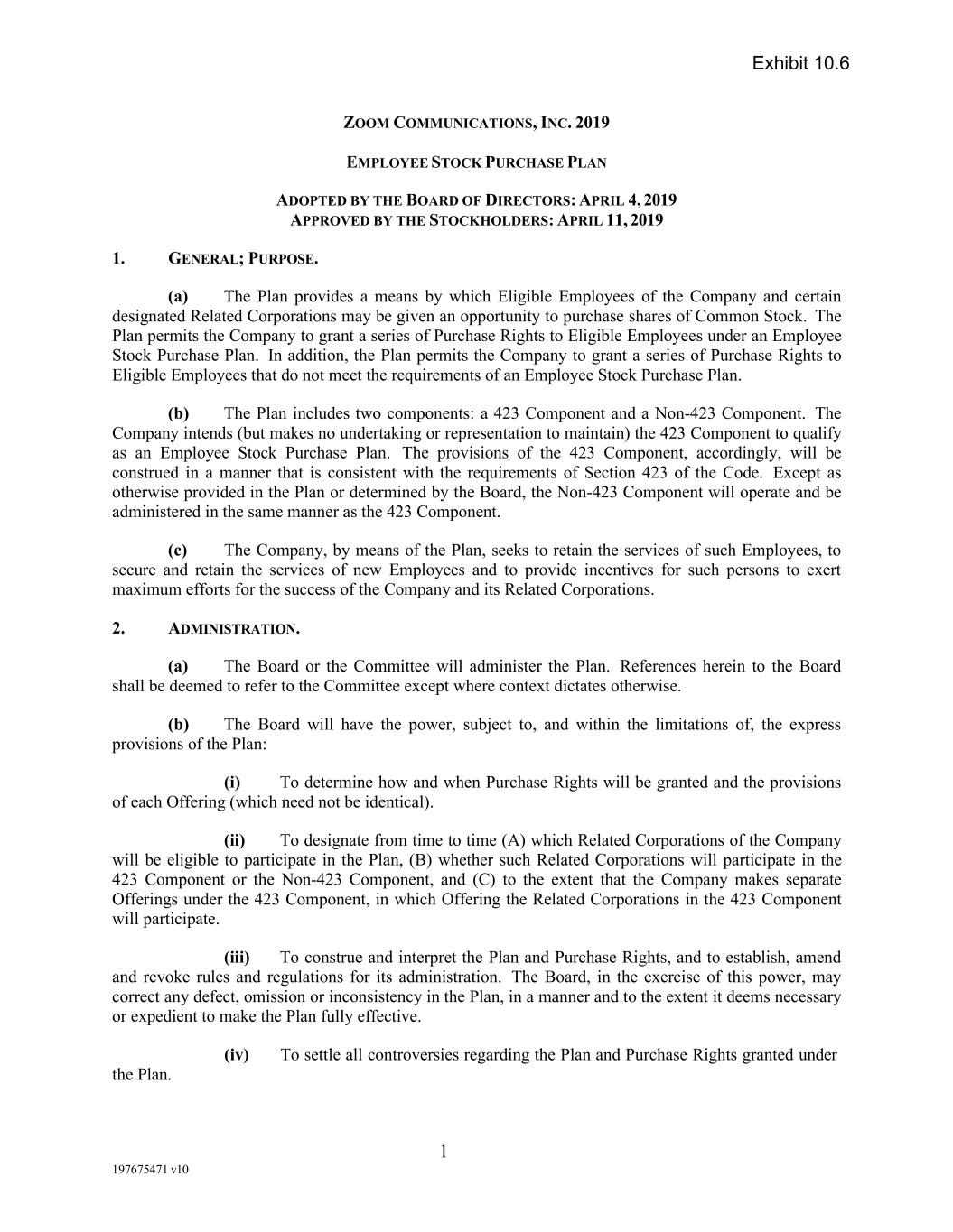 1 197675471 v10 ZOOM COMMUNICATIONS, INC. 2019 EMPLOYEE STOCK PURCHASE PLAN ADOPTED BY THE BOARD OF DIRECTORS: APRIL 4, 2019 APPROVED BY THE STOCKHOLDERS: APRIL 11, 2019 1. GENERAL; PURPOSE. (a) The Plan provides a means by which Eligible Employees of the Company and certain designated Related Corporations may be given an opportunity to purchase shares of Common Stock. The Plan permits the Company to grant a series of Purchase Rights to Eligible Employees under an Employee Stock Purchase Plan. In addition, the Plan permits the Company to grant a series of Purchase Rights to Eligible Employees that do not meet the requirements of an Employee Stock Purchase Plan. (b) The Plan includes two components: a 423 Component and a Non-423 Component. The Company intends (but makes no undertaking or representation to maintain) the 423 Component to qualify as an Employee Stock Purchase Plan. The provisions of the 423 Component, accordingly, will be construed in a manner that is consistent with the requirements of Section 423 of the Code. Except as otherwise provided in the Plan or determined by the Board, the Non-423 Component will operate and be administered in the same manner as the 423 Component. (c) The Company, by means of the Plan, seeks to retain the services of such Employees, to secure and retain the services of new Employees and to provide incentives for such persons to exert maximum efforts for the success of the Company and its Related Corporations. 2. ADMINISTRATION. (a) The Board or the Committee will administer the Plan. References herein to the Board shall be deemed to refer to the Committee except where context dictates otherwise. (b) The Board will have the power, subject to, and within the limitations of, the express provisions of the Plan: (i) To determine how and when Purchase Rights will be granted and the provisions of each Offering (which need not be identical). (ii) To designate from time to time (A) which Related Corporations of the Company will be eligible to participate in the Plan, (B) whether such Related Corporations will participate in the 423 Component or the Non-423 Component, and (C) to the extent that the Company makes separate Offerings under the 423 Component, in which Offering the Related Corporations in the 423 Component will participate. (iii) To construe and interpret the Plan and Purchase Rights, and to establish, amend and revoke rules and regulations for its administration. The Board, in the exercise of this power, may correct any defect, omission or inconsistency in the Plan, in a manner and to the extent it deems necessary or expedient to make the Plan fully effective. (iv) To settle all controversies regarding the Plan and Purchase Rights granted under the Plan. Exhibit 10.6