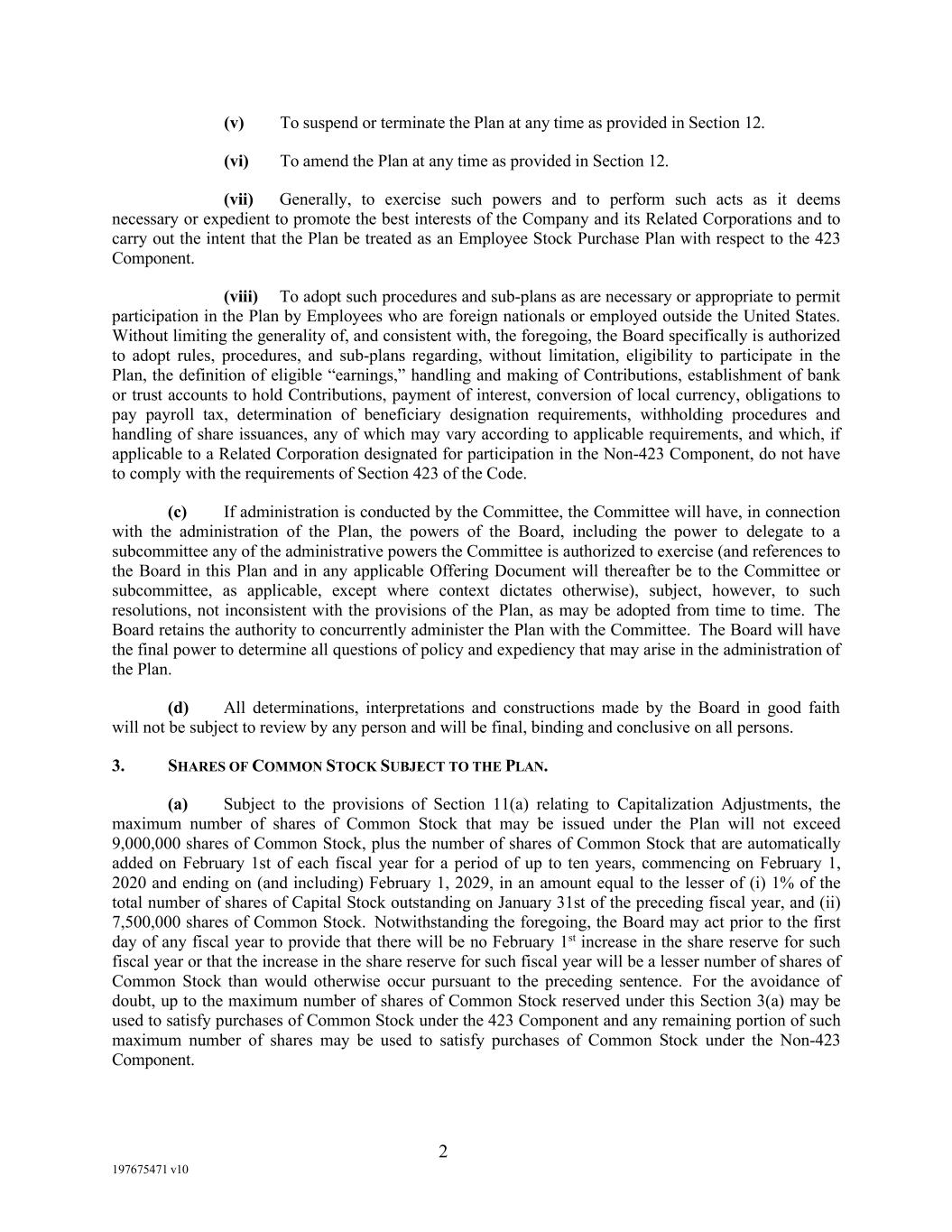 2 197675471 v10 (v) To suspend or terminate the Plan at any time as provided in Section 12. (vi) To amend the Plan at any time as provided in Section 12. (vii) Generally, to exercise such powers and to perform such acts as it deems necessary or expedient to promote the best interests of the Company and its Related Corporations and to carry out the intent that the Plan be treated as an Employee Stock Purchase Plan with respect to the 423 Component. (viii) To adopt such procedures and sub-plans as are necessary or appropriate to permit participation in the Plan by Employees who are foreign nationals or employed outside the United States. Without limiting the generality of, and consistent with, the foregoing, the Board specifically is authorized to adopt rules, procedures, and sub-plans regarding, without limitation, eligibility to participate in the Plan, the definition of eligible “earnings,” handling and making of Contributions, establishment of bank or trust accounts to hold Contributions, payment of interest, conversion of local currency, obligations to pay payroll tax, determination of beneficiary designation requirements, withholding procedures and handling of share issuances, any of which may vary according to applicable requirements, and which, if applicable to a Related Corporation designated for participation in the Non-423 Component, do not have to comply with the requirements of Section 423 of the Code. (c) If administration is conducted by the Committee, the Committee will have, in connection with the administration of the Plan, the powers of the Board, including the power to delegate to a subcommittee any of the administrative powers the Committee is authorized to exercise (and references to the Board in this Plan and in any applicable Offering Document will thereafter be to the Committee or subcommittee, as applicable, except where context dictates otherwise), subject, however, to such resolutions, not inconsistent with the provisions of the Plan, as may be adopted from time to time. The Board retains the authority to concurrently administer the Plan with the Committee. The Board will have the final power to determine all questions of policy and expediency that may arise in the administration of the Plan. (d) All determinations, interpretations and constructions made by the Board in good faith will not be subject to review by any person and will be final, binding and conclusive on all persons. 3. SHARES OF COMMON STOCK SUBJECT TO THE PLAN. (a) Subject to the provisions of Section 11(a) relating to Capitalization Adjustments, the maximum number of shares of Common Stock that may be issued under the Plan will not exceed 9,000,000 shares of Common Stock, plus the number of shares of Common Stock that are automatically added on February 1st of each fiscal year for a period of up to ten years, commencing on February 1, 2020 and ending on (and including) February 1, 2029, in an amount equal to the lesser of (i) 1% of the total number of shares of Capital Stock outstanding on January 31st of the preceding fiscal year, and (ii) 7,500,000 shares of Common Stock. Notwithstanding the foregoing, the Board may act prior to the first day of any fiscal year to provide that there will be no February 1st increase in the share reserve for such fiscal year or that the increase in the share reserve for such fiscal year will be a lesser number of shares of Common Stock than would otherwise occur pursuant to the preceding sentence. For the avoidance of doubt, up to the maximum number of shares of Common Stock reserved under this Section 3(a) may be used to satisfy purchases of Common Stock under the 423 Component and any remaining portion of such maximum number of shares may be used to satisfy purchases of Common Stock under the Non-423 Component.