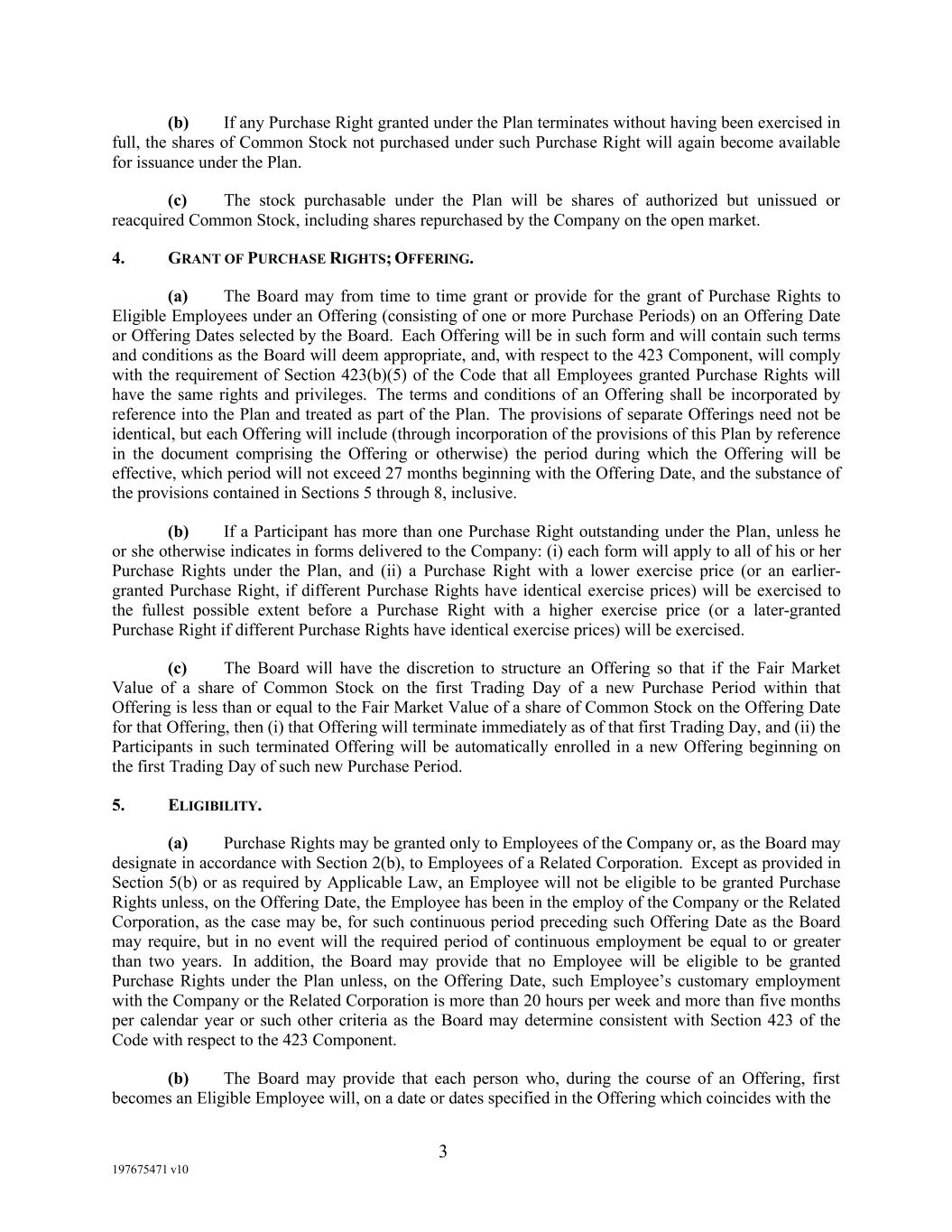 3 197675471 v10 (b) If any Purchase Right granted under the Plan terminates without having been exercised in full, the shares of Common Stock not purchased under such Purchase Right will again become available for issuance under the Plan. (c) The stock purchasable under the Plan will be shares of authorized but unissued or reacquired Common Stock, including shares repurchased by the Company on the open market. 4. GRANT OF PURCHASE RIGHTS; OFFERING. (a) The Board may from time to time grant or provide for the grant of Purchase Rights to Eligible Employees under an Offering (consisting of one or more Purchase Periods) on an Offering Date or Offering Dates selected by the Board. Each Offering will be in such form and will contain such terms and conditions as the Board will deem appropriate, and, with respect to the 423 Component, will comply with the requirement of Section 423(b)(5) of the Code that all Employees granted Purchase Rights will have the same rights and privileges. The terms and conditions of an Offering shall be incorporated by reference into the Plan and treated as part of the Plan. The provisions of separate Offerings need not be identical, but each Offering will include (through incorporation of the provisions of this Plan by reference in the document comprising the Offering or otherwise) the period during which the Offering will be effective, which period will not exceed 27 months beginning with the Offering Date, and the substance of the provisions contained in Sections 5 through 8, inclusive. (b) If a Participant has more than one Purchase Right outstanding under the Plan, unless he or she otherwise indicates in forms delivered to the Company: (i) each form will apply to all of his or her Purchase Rights under the Plan, and (ii) a Purchase Right with a lower exercise price (or an earlier- granted Purchase Right, if different Purchase Rights have identical exercise prices) will be exercised to the fullest possible extent before a Purchase Right with a higher exercise price (or a later-granted Purchase Right if different Purchase Rights have identical exercise prices) will be exercised. (c) The Board will have the discretion to structure an Offering so that if the Fair Market Value of a share of Common Stock on the first Trading Day of a new Purchase Period within that Offering is less than or equal to the Fair Market Value of a share of Common Stock on the Offering Date for that Offering, then (i) that Offering will terminate immediately as of that first Trading Day, and (ii) the Participants in such terminated Offering will be automatically enrolled in a new Offering beginning on the first Trading Day of such new Purchase Period. 5. ELIGIBILITY. (a) Purchase Rights may be granted only to Employees of the Company or, as the Board may designate in accordance with Section 2(b), to Employees of a Related Corporation. Except as provided in Section 5(b) or as required by Applicable Law, an Employee will not be eligible to be granted Purchase Rights unless, on the Offering Date, the Employee has been in the employ of the Company or the Related Corporation, as the case may be, for such continuous period preceding such Offering Date as the Board may require, but in no event will the required period of continuous employment be equal to or greater than two years. In addition, the Board may provide that no Employee will be eligible to be granted Purchase Rights under the Plan unless, on the Offering Date, such Employee’s customary employment with the Company or the Related Corporation is more than 20 hours per week and more than five months per calendar year or such other criteria as the Board may determine consistent with Section 423 of the Code with respect to the 423 Component. (b) The Board may provide that each person who, during the course of an Offering, first becomes an Eligible Employee will, on a date or dates specified in the Offering which coincides with the