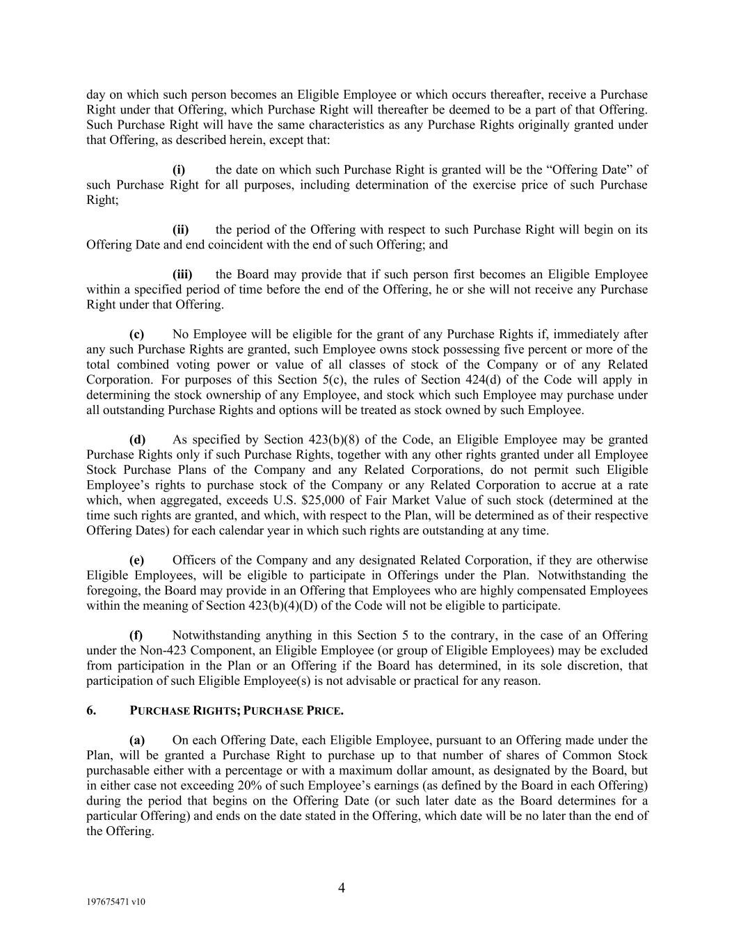4 197675471 v10 day on which such person becomes an Eligible Employee or which occurs thereafter, receive a Purchase Right under that Offering, which Purchase Right will thereafter be deemed to be a part of that Offering. Such Purchase Right will have the same characteristics as any Purchase Rights originally granted under that Offering, as described herein, except that: (i) the date on which such Purchase Right is granted will be the “Offering Date” of such Purchase Right for all purposes, including determination of the exercise price of such Purchase Right; (ii) the period of the Offering with respect to such Purchase Right will begin on its Offering Date and end coincident with the end of such Offering; and (iii) the Board may provide that if such person first becomes an Eligible Employee within a specified period of time before the end of the Offering, he or she will not receive any Purchase Right under that Offering. (c) No Employee will be eligible for the grant of any Purchase Rights if, immediately after any such Purchase Rights are granted, such Employee owns stock possessing five percent or more of the total combined voting power or value of all classes of stock of the Company or of any Related Corporation. For purposes of this Section 5(c), the rules of Section 424(d) of the Code will apply in determining the stock ownership of any Employee, and stock which such Employee may purchase under all outstanding Purchase Rights and options will be treated as stock owned by such Employee. (d) As specified by Section 423(b)(8) of the Code, an Eligible Employee may be granted Purchase Rights only if such Purchase Rights, together with any other rights granted under all Employee Stock Purchase Plans of the Company and any Related Corporations, do not permit such Eligible Employee’s rights to purchase stock of the Company or any Related Corporation to accrue at a rate which, when aggregated, exceeds U.S. $25,000 of Fair Market Value of such stock (determined at the time such rights are granted, and which, with respect to the Plan, will be determined as of their respective Offering Dates) for each calendar year in which such rights are outstanding at any time. (e) Officers of the Company and any designated Related Corporation, if they are otherwise Eligible Employees, will be eligible to participate in Offerings under the Plan. Notwithstanding the foregoing, the Board may provide in an Offering that Employees who are highly compensated Employees within the meaning of Section 423(b)(4)(D) of the Code will not be eligible to participate. (f) Notwithstanding anything in this Section 5 to the contrary, in the case of an Offering under the Non-423 Component, an Eligible Employee (or group of Eligible Employees) may be excluded from participation in the Plan or an Offering if the Board has determined, in its sole discretion, that participation of such Eligible Employee(s) is not advisable or practical for any reason. 6. PURCHASE RIGHTS; PURCHASE PRICE. (a) On each Offering Date, each Eligible Employee, pursuant to an Offering made under the Plan, will be granted a Purchase Right to purchase up to that number of shares of Common Stock purchasable either with a percentage or with a maximum dollar amount, as designated by the Board, but in either case not exceeding 20% of such Employee’s earnings (as defined by the Board in each Offering) during the period that begins on the Offering Date (or such later date as the Board determines for a particular Offering) and ends on the date stated in the Offering, which date will be no later than the end of the Offering.