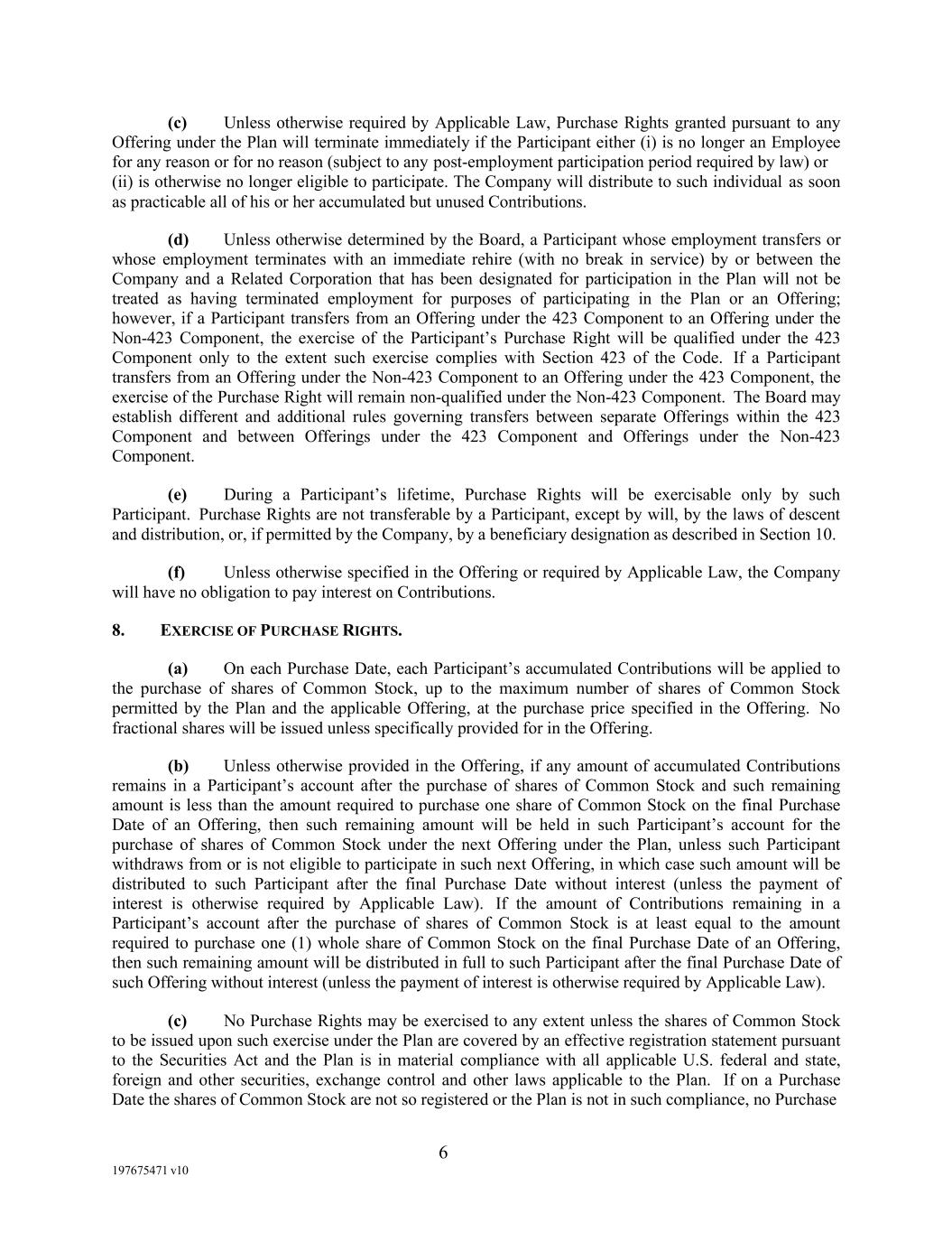 6 197675471 v10 (c) Unless otherwise required by Applicable Law, Purchase Rights granted pursuant to any Offering under the Plan will terminate immediately if the Participant either (i) is no longer an Employee for any reason or for no reason (subject to any post-employment participation period required by law) or (ii) is otherwise no longer eligible to participate. The Company will distribute to such individual as soon as practicable all of his or her accumulated but unused Contributions. (d) Unless otherwise determined by the Board, a Participant whose employment transfers or whose employment terminates with an immediate rehire (with no break in service) by or between the Company and a Related Corporation that has been designated for participation in the Plan will not be treated as having terminated employment for purposes of participating in the Plan or an Offering; however, if a Participant transfers from an Offering under the 423 Component to an Offering under the Non-423 Component, the exercise of the Participant’s Purchase Right will be qualified under the 423 Component only to the extent such exercise complies with Section 423 of the Code. If a Participant transfers from an Offering under the Non-423 Component to an Offering under the 423 Component, the exercise of the Purchase Right will remain non-qualified under the Non-423 Component. The Board may establish different and additional rules governing transfers between separate Offerings within the 423 Component and between Offerings under the 423 Component and Offerings under the Non-423 Component. (e) During a Participant’s lifetime, Purchase Rights will be exercisable only by such Participant. Purchase Rights are not transferable by a Participant, except by will, by the laws of descent and distribution, or, if permitted by the Company, by a beneficiary designation as described in Section 10. (f) Unless otherwise specified in the Offering or required by Applicable Law, the Company will have no obligation to pay interest on Contributions. 8. EXERCISE OF PURCHASE RIGHTS. (a) On each Purchase Date, each Participant’s accumulated Contributions will be applied to the purchase of shares of Common Stock, up to the maximum number of shares of Common Stock permitted by the Plan and the applicable Offering, at the purchase price specified in the Offering. No fractional shares will be issued unless specifically provided for in the Offering. (b) Unless otherwise provided in the Offering, if any amount of accumulated Contributions remains in a Participant’s account after the purchase of shares of Common Stock and such remaining amount is less than the amount required to purchase one share of Common Stock on the final Purchase Date of an Offering, then such remaining amount will be held in such Participant’s account for the purchase of shares of Common Stock under the next Offering under the Plan, unless such Participant withdraws from or is not eligible to participate in such next Offering, in which case such amount will be distributed to such Participant after the final Purchase Date without interest (unless the payment of interest is otherwise required by Applicable Law). If the amount of Contributions remaining in a Participant’s account after the purchase of shares of Common Stock is at least equal to the amount required to purchase one (1) whole share of Common Stock on the final Purchase Date of an Offering, then such remaining amount will be distributed in full to such Participant after the final Purchase Date of such Offering without interest (unless the payment of interest is otherwise required by Applicable Law). (c) No Purchase Rights may be exercised to any extent unless the shares of Common Stock to be issued upon such exercise under the Plan are covered by an effective registration statement pursuant to the Securities Act and the Plan is in material compliance with all applicable U.S. federal and state, foreign and other securities, exchange control and other laws applicable to the Plan. If on a Purchase Date the shares of Common Stock are not so registered or the Plan is not in such compliance, no Purchase