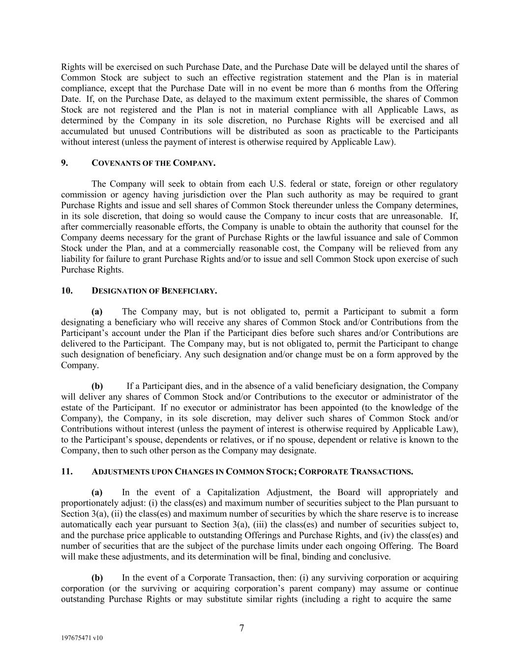 7 197675471 v10 Rights will be exercised on such Purchase Date, and the Purchase Date will be delayed until the shares of Common Stock are subject to such an effective registration statement and the Plan is in material compliance, except that the Purchase Date will in no event be more than 6 months from the Offering Date. If, on the Purchase Date, as delayed to the maximum extent permissible, the shares of Common Stock are not registered and the Plan is not in material compliance with all Applicable Laws, as determined by the Company in its sole discretion, no Purchase Rights will be exercised and all accumulated but unused Contributions will be distributed as soon as practicable to the Participants without interest (unless the payment of interest is otherwise required by Applicable Law). 9. COVENANTS OF THE COMPANY. The Company will seek to obtain from each U.S. federal or state, foreign or other regulatory commission or agency having jurisdiction over the Plan such authority as may be required to grant Purchase Rights and issue and sell shares of Common Stock thereunder unless the Company determines, in its sole discretion, that doing so would cause the Company to incur costs that are unreasonable. If, after commercially reasonable efforts, the Company is unable to obtain the authority that counsel for the Company deems necessary for the grant of Purchase Rights or the lawful issuance and sale of Common Stock under the Plan, and at a commercially reasonable cost, the Company will be relieved from any liability for failure to grant Purchase Rights and/or to issue and sell Common Stock upon exercise of such Purchase Rights. 10. DESIGNATION OF BENEFICIARY. (a) The Company may, but is not obligated to, permit a Participant to submit a form designating a beneficiary who will receive any shares of Common Stock and/or Contributions from the Participant’s account under the Plan if the Participant dies before such shares and/or Contributions are delivered to the Participant. The Company may, but is not obligated to, permit the Participant to change such designation of beneficiary. Any such designation and/or change must be on a form approved by the Company. (b) If a Participant dies, and in the absence of a valid beneficiary designation, the Company will deliver any shares of Common Stock and/or Contributions to the executor or administrator of the estate of the Participant. If no executor or administrator has been appointed (to the knowledge of the Company), the Company, in its sole discretion, may deliver such shares of Common Stock and/or Contributions without interest (unless the payment of interest is otherwise required by Applicable Law), to the Participant’s spouse, dependents or relatives, or if no spouse, dependent or relative is known to the Company, then to such other person as the Company may designate. 11. ADJUSTMENTS UPON CHANGES IN COMMON STOCK; CORPORATE TRANSACTIONS. (a) In the event of a Capitalization Adjustment, the Board will appropriately and proportionately adjust: (i) the class(es) and maximum number of securities subject to the Plan pursuant to Section 3(a), (ii) the class(es) and maximum number of securities by which the share reserve is to increase automatically each year pursuant to Section 3(a), (iii) the class(es) and number of securities subject to, and the purchase price applicable to outstanding Offerings and Purchase Rights, and (iv) the class(es) and number of securities that are the subject of the purchase limits under each ongoing Offering. The Board will make these adjustments, and its determination will be final, binding and conclusive. (b) In the event of a Corporate Transaction, then: (i) any surviving corporation or acquiring corporation (or the surviving or acquiring corporation’s parent company) may assume or continue outstanding Purchase Rights or may substitute similar rights (including a right to acquire the same
