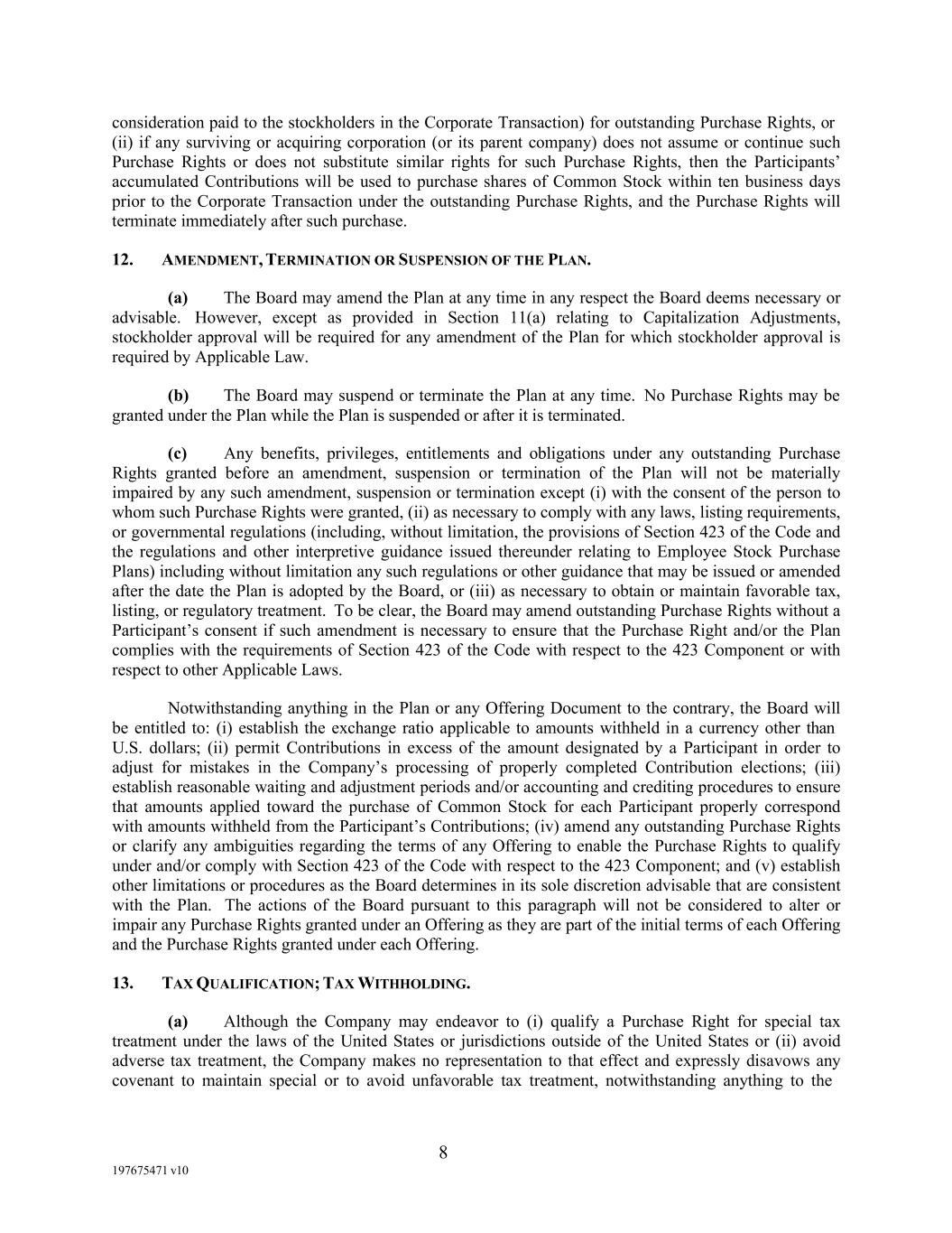 8 197675471 v10 consideration paid to the stockholders in the Corporate Transaction) for outstanding Purchase Rights, or (ii) if any surviving or acquiring corporation (or its parent company) does not assume or continue such Purchase Rights or does not substitute similar rights for such Purchase Rights, then the Participants’ accumulated Contributions will be used to purchase shares of Common Stock within ten business days prior to the Corporate Transaction under the outstanding Purchase Rights, and the Purchase Rights will terminate immediately after such purchase. 12. AMENDMENT, TERMINATION OR SUSPENSION OF THE PLAN. (a) The Board may amend the Plan at any time in any respect the Board deems necessary or advisable. However, except as provided in Section 11(a) relating to Capitalization Adjustments, stockholder approval will be required for any amendment of the Plan for which stockholder approval is required by Applicable Law. (b) The Board may suspend or terminate the Plan at any time. No Purchase Rights may be granted under the Plan while the Plan is suspended or after it is terminated. (c) Any benefits, privileges, entitlements and obligations under any outstanding Purchase Rights granted before an amendment, suspension or termination of the Plan will not be materially impaired by any such amendment, suspension or termination except (i) with the consent of the person to whom such Purchase Rights were granted, (ii) as necessary to comply with any laws, listing requirements, or governmental regulations (including, without limitation, the provisions of Section 423 of the Code and the regulations and other interpretive guidance issued thereunder relating to Employee Stock Purchase Plans) including without limitation any such regulations or other guidance that may be issued or amended after the date the Plan is adopted by the Board, or (iii) as necessary to obtain or maintain favorable tax, listing, or regulatory treatment. To be clear, the Board may amend outstanding Purchase Rights without a Participant’s consent if such amendment is necessary to ensure that the Purchase Right and/or the Plan complies with the requirements of Section 423 of the Code with respect to the 423 Component or with respect to other Applicable Laws. Notwithstanding anything in the Plan or any Offering Document to the contrary, the Board will be entitled to: (i) establish the exchange ratio applicable to amounts withheld in a currency other than U.S. dollars; (ii) permit Contributions in excess of the amount designated by a Participant in order to adjust for mistakes in the Company’s processing of properly completed Contribution elections; (iii) establish reasonable waiting and adjustment periods and/or accounting and crediting procedures to ensure that amounts applied toward the purchase of Common Stock for each Participant properly correspond with amounts withheld from the Participant’s Contributions; (iv) amend any outstanding Purchase Rights or clarify any ambiguities regarding the terms of any Offering to enable the Purchase Rights to qualify under and/or comply with Section 423 of the Code with respect to the 423 Component; and (v) establish other limitations or procedures as the Board determines in its sole discretion advisable that are consistent with the Plan. The actions of the Board pursuant to this paragraph will not be considered to alter or impair any Purchase Rights granted under an Offering as they are part of the initial terms of each Offering and the Purchase Rights granted under each Offering. 13. TAX QUALIFICATION; TAX WITHHOLDING. (a) Although the Company may endeavor to (i) qualify a Purchase Right for special tax treatment under the laws of the United States or jurisdictions outside of the United States or (ii) avoid adverse tax treatment, the Company makes no representation to that effect and expressly disavows any covenant to maintain special or to avoid unfavorable tax treatment, notwithstanding anything to the