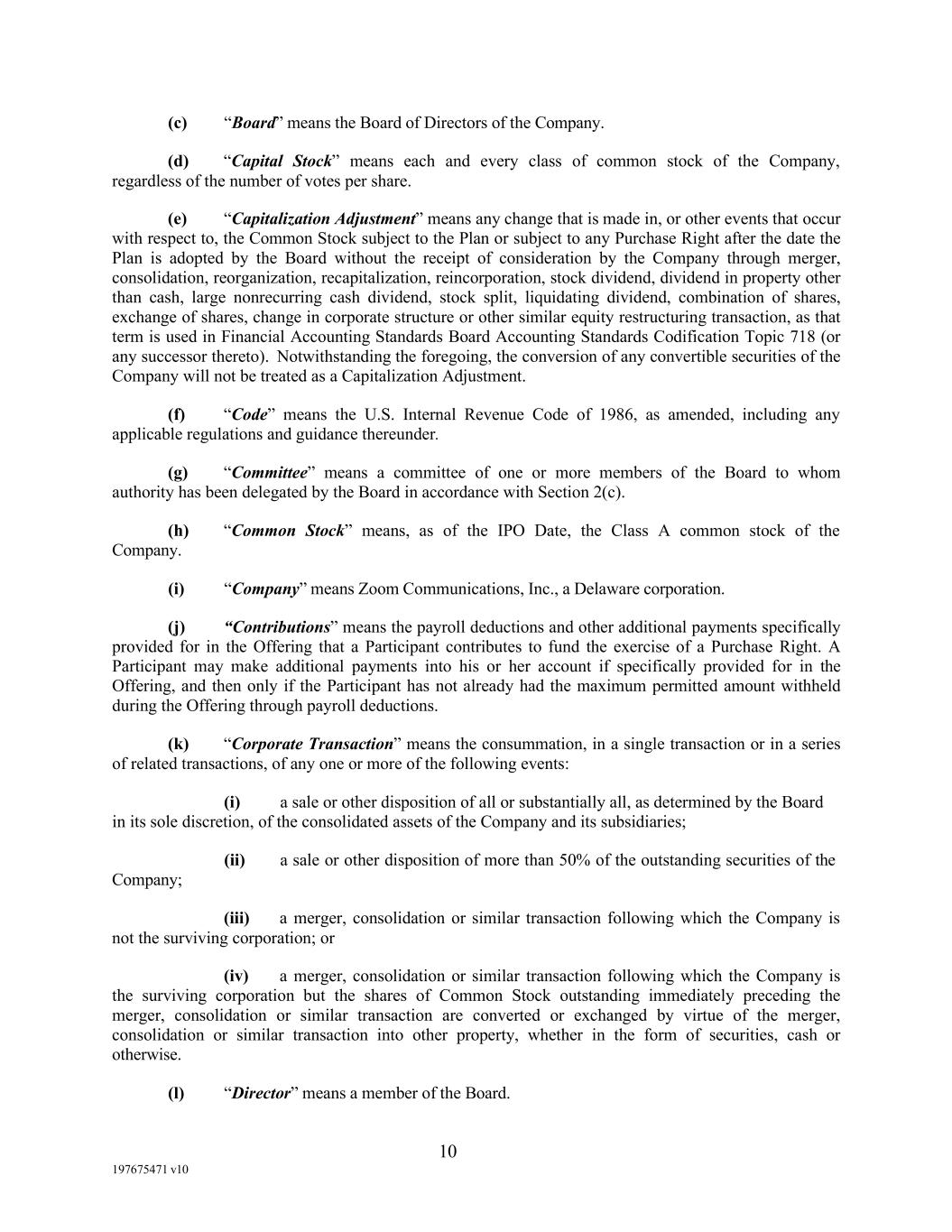 10 197675471 v10 (c) “Board” means the Board of Directors of the Company. (d) “Capital Stock” means each and every class of common stock of the Company, regardless of the number of votes per share. (e) “Capitalization Adjustment” means any change that is made in, or other events that occur with respect to, the Common Stock subject to the Plan or subject to any Purchase Right after the date the Plan is adopted by the Board without the receipt of consideration by the Company through merger, consolidation, reorganization, recapitalization, reincorporation, stock dividend, dividend in property other than cash, large nonrecurring cash dividend, stock split, liquidating dividend, combination of shares, exchange of shares, change in corporate structure or other similar equity restructuring transaction, as that term is used in Financial Accounting Standards Board Accounting Standards Codification Topic 718 (or any successor thereto). Notwithstanding the foregoing, the conversion of any convertible securities of the Company will not be treated as a Capitalization Adjustment. (f) “Code” means the U.S. Internal Revenue Code of 1986, as amended, including any applicable regulations and guidance thereunder. (g) “Committee” means a committee of one or more members of the Board to whom authority has been delegated by the Board in accordance with Section 2(c). (h) “Common Stock” means, as of the IPO Date, the Class A common stock of the Company. (i) “Company” means Zoom Communications, Inc., a Delaware corporation. (j) “Contributions” means the payroll deductions and other additional payments specifically provided for in the Offering that a Participant contributes to fund the exercise of a Purchase Right. A Participant may make additional payments into his or her account if specifically provided for in the Offering, and then only if the Participant has not already had the maximum permitted amount withheld during the Offering through payroll deductions. (k) “Corporate Transaction” means the consummation, in a single transaction or in a series of related transactions, of any one or more of the following events: (i) a sale or other disposition of all or substantially all, as determined by the Board in its sole discretion, of the consolidated assets of the Company and its subsidiaries; (ii) a sale or other disposition of more than 50% of the outstanding securities of the Company; (iii) a merger, consolidation or similar transaction following which the Company is not the surviving corporation; or (iv) a merger, consolidation or similar transaction following which the Company is the surviving corporation but the shares of Common Stock outstanding immediately preceding the merger, consolidation or similar transaction are converted or exchanged by virtue of the merger, consolidation or similar transaction into other property, whether in the form of securities, cash or otherwise. (l) “Director” means a member of the Board.