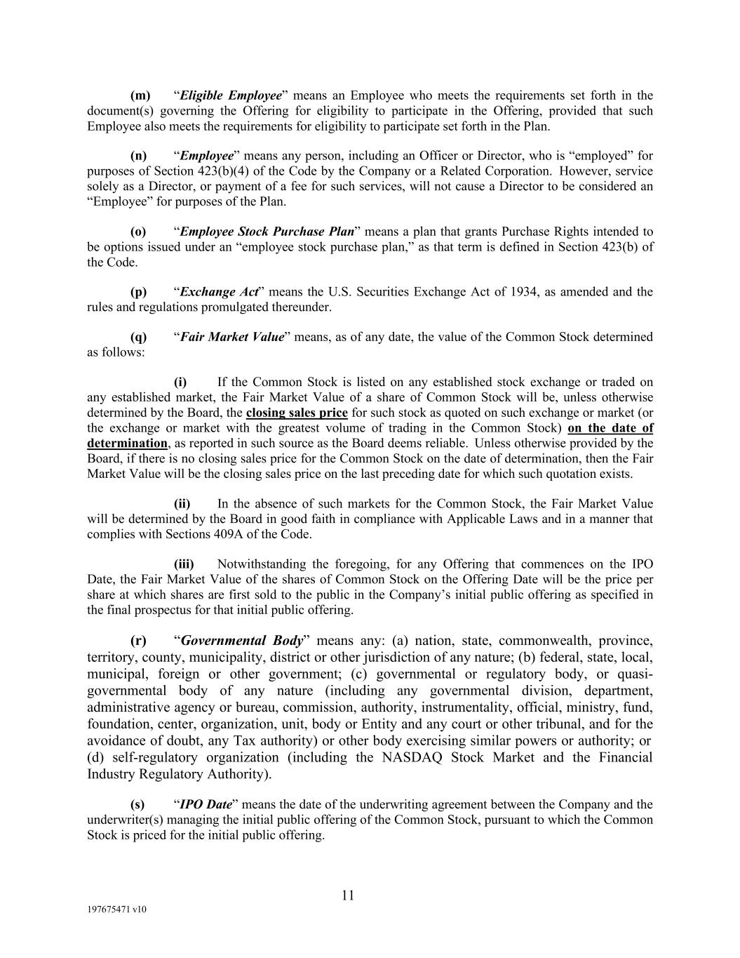 11 197675471 v10 (m) “Eligible Employee” means an Employee who meets the requirements set forth in the document(s) governing the Offering for eligibility to participate in the Offering, provided that such Employee also meets the requirements for eligibility to participate set forth in the Plan. (n) “Employee” means any person, including an Officer or Director, who is “employed” for purposes of Section 423(b)(4) of the Code by the Company or a Related Corporation. However, service solely as a Director, or payment of a fee for such services, will not cause a Director to be considered an “Employee” for purposes of the Plan. (o) “Employee Stock Purchase Plan” means a plan that grants Purchase Rights intended to be options issued under an “employee stock purchase plan,” as that term is defined in Section 423(b) of the Code. (p) “Exchange Act” means the U.S. Securities Exchange Act of 1934, as amended and the rules and regulations promulgated thereunder. (q) “Fair Market Value” means, as of any date, the value of the Common Stock determined as follows: (i) If the Common Stock is listed on any established stock exchange or traded on any established market, the Fair Market Value of a share of Common Stock will be, unless otherwise determined by the Board, the closing sales price for such stock as quoted on such exchange or market (or the exchange or market with the greatest volume of trading in the Common Stock) on the date of determination, as reported in such source as the Board deems reliable. Unless otherwise provided by the Board, if there is no closing sales price for the Common Stock on the date of determination, then the Fair Market Value will be the closing sales price on the last preceding date for which such quotation exists. (ii) In the absence of such markets for the Common Stock, the Fair Market Value will be determined by the Board in good faith in compliance with Applicable Laws and in a manner that complies with Sections 409A of the Code. (iii) Notwithstanding the foregoing, for any Offering that commences on the IPO Date, the Fair Market Value of the shares of Common Stock on the Offering Date will be the price per share at which shares are first sold to the public in the Company’s initial public offering as specified in the final prospectus for that initial public offering. (r) “Governmental Body” means any: (a) nation, state, commonwealth, province, territory, county, municipality, district or other jurisdiction of any nature; (b) federal, state, local, municipal, foreign or other government; (c) governmental or regulatory body, or quasi- governmental body of any nature (including any governmental division, department, administrative agency or bureau, commission, authority, instrumentality, official, ministry, fund, foundation, center, organization, unit, body or Entity and any court or other tribunal, and for the avoidance of doubt, any Tax authority) or other body exercising similar powers or authority; or (d) self-regulatory organization (including the NASDAQ Stock Market and the Financial Industry Regulatory Authority). (s) “IPO Date” means the date of the underwriting agreement between the Company and the underwriter(s) managing the initial public offering of the Common Stock, pursuant to which the Common Stock is priced for the initial public offering.