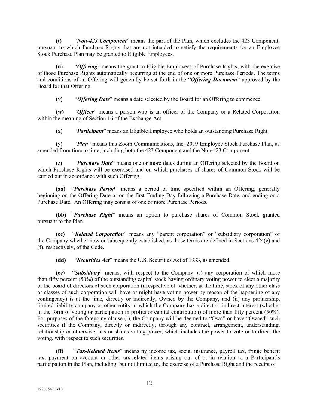 12 197675471 v10 (t) “Non-423 Component” means the part of the Plan, which excludes the 423 Component, pursuant to which Purchase Rights that are not intended to satisfy the requirements for an Employee Stock Purchase Plan may be granted to Eligible Employees. (u) “Offering” means the grant to Eligible Employees of Purchase Rights, with the exercise of those Purchase Rights automatically occurring at the end of one or more Purchase Periods. The terms and conditions of an Offering will generally be set forth in the “Offering Document” approved by the Board for that Offering. (v) “Offering Date” means a date selected by the Board for an Offering to commence. (w) “Officer” means a person who is an officer of the Company or a Related Corporation within the meaning of Section 16 of the Exchange Act. (x) “Participant” means an Eligible Employee who holds an outstanding Purchase Right. (y) “Plan” means this Zoom Communications, Inc. 2019 Employee Stock Purchase Plan, as amended from time to time, including both the 423 Component and the Non-423 Component. (z) “Purchase Date” means one or more dates during an Offering selected by the Board on which Purchase Rights will be exercised and on which purchases of shares of Common Stock will be carried out in accordance with such Offering. (aa) “Purchase Period” means a period of time specified within an Offering, generally beginning on the Offering Date or on the first Trading Day following a Purchase Date, and ending on a Purchase Date. An Offering may consist of one or more Purchase Periods. (bb) “Purchase Right” means an option to purchase shares of Common Stock granted pursuant to the Plan. (cc) “Related Corporation” means any “parent corporation” or “subsidiary corporation” of the Company whether now or subsequently established, as those terms are defined in Sections 424(e) and (f), respectively, of the Code. (dd) “Securities Act” means the U.S. Securities Act of 1933, as amended. (ee) “Subsidiary” means, with respect to the Company, (i) any corporation of which more than fifty percent (50%) of the outstanding capital stock having ordinary voting power to elect a majority of the board of directors of such corporation (irrespective of whether, at the time, stock of any other class or classes of such corporation will have or might have voting power by reason of the happening of any contingency) is at the time, directly or indirectly, Owned by the Company, and (ii) any partnership, limited liability company or other entity in which the Company has a direct or indirect interest (whether in the form of voting or participation in profits or capital contribution) of more than fifty percent (50%). For purposes of the foregoing clause (i), the Company will be deemed to “Own” or have “Owned” such securities if the Company, directly or indirectly, through any contract, arrangement, understanding, relationship or otherwise, has or shares voting power, which includes the power to vote or to direct the voting, with respect to such securities. (ff) “Tax-Related Items” means ny income tax, social insurance, payroll tax, fringe benefit tax, payment on account or other tax-related items arising out of or in relation to a Participant’s participation in the Plan, including, but not limited to, the exercise of a Purchase Right and the receipt of