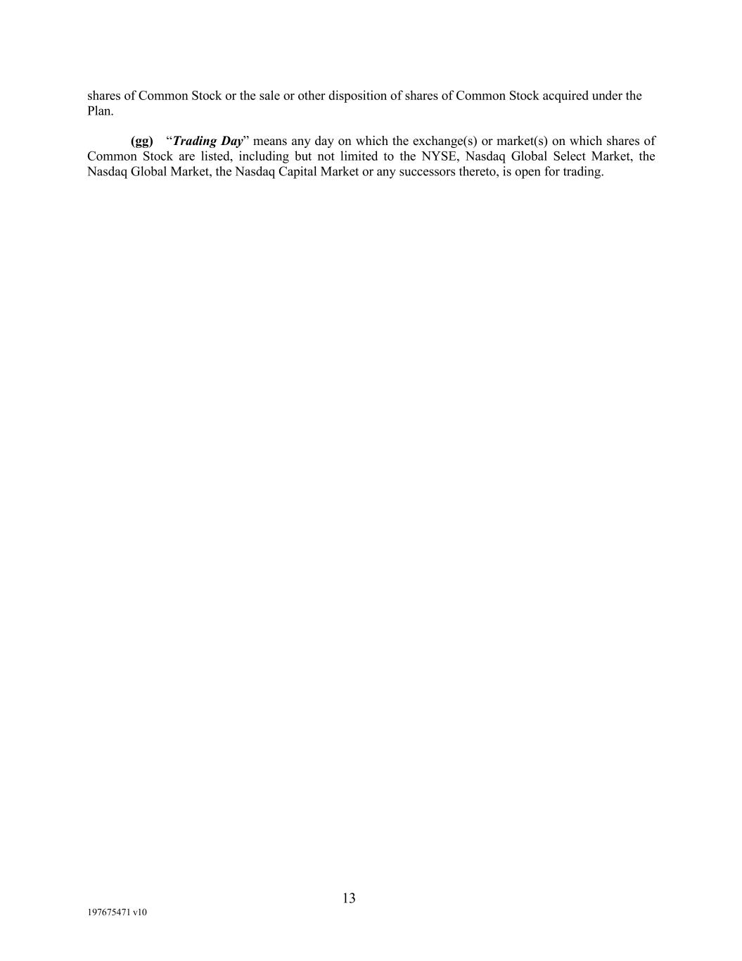13 197675471 v10 shares of Common Stock or the sale or other disposition of shares of Common Stock acquired under the Plan. (gg) “Trading Day” means any day on which the exchange(s) or market(s) on which shares of Common Stock are listed, including but not limited to the NYSE, Nasdaq Global Select Market, the Nasdaq Global Market, the Nasdaq Capital Market or any successors thereto, is open for trading.