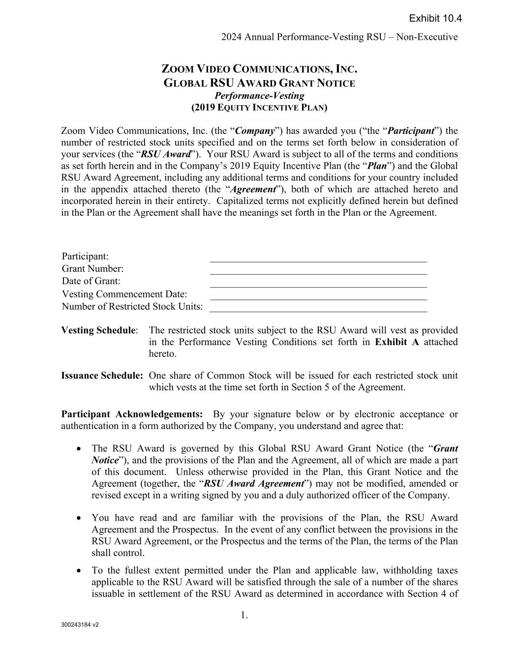 300243184 v2 2024 Annual Performance-Vesting RSU – Non-Executive 1. ZOOM VIDEO COMMUNICATIONS, INC. GLOBAL RSU AWARD GRANT NOTICE Performance-Vesting (2019 EQUITY INCENTIVE PLAN) Zoom Video Communications, Inc. (the “Company”) has awarded you (“the “Participant”) the number of restricted stock units specified and on the terms set forth below in consideration of your services (the “RSU Award”). Your RSU Award is subject to all of the terms and conditions as set forth herein and in the Company’s 2019 Equity Incentive Plan (the “Plan”) and the Global RSU Award Agreement, including any additional terms and conditions for your country included in the appendix attached thereto (the “Agreement”), both of which are attached hereto and incorporated herein in their entirety. Capitalized terms not explicitly defined herein but defined in the Plan or the Agreement shall have the meanings set forth in the Plan or the Agreement. Participant: Grant Number: Date of Grant: Vesting Commencement Date: Number of Restricted Stock Units: Vesting Schedule: The restricted stock units subject to the RSU Award will vest as provided in the Performance Vesting Conditions set forth in Exhibit A attached hereto. Issuance Schedule: One share of Common Stock will be issued for each restricted stock unit which vests at the time set forth in Section 5 of the Agreement. Participant Acknowledgements: By your signature below or by electronic acceptance or authentication in a form authorized by the Company, you understand and agree that: The RSU Award is governed by this Global RSU Award Grant Notice (the “Grant Notice”), and the provisions of the Plan and the Agreement, all of which are made a part of this document. Unless otherwise provided in the Plan, this Grant Notice and the Agreement (together, the “RSU Award Agreement”) may not be modified, amended or revised except in a writing signed by you and a duly authorized officer of the Company. You have read and are familiar with the provisions of the Plan, the RSU Award Agreement and the Prospectus. In the event of any conflict between the provisions in the RSU Award Agreement, or the Prospectus and the terms of the Plan, the terms of the Plan shall control. To the fullest extent permitted under the Plan and applicable law, withholding taxes applicable to the RSU Award will be satisfied through the sale of a number of the shares issuable in settlement of the RSU Award as determined in accordance with Section 4 of Exhibit 10.4