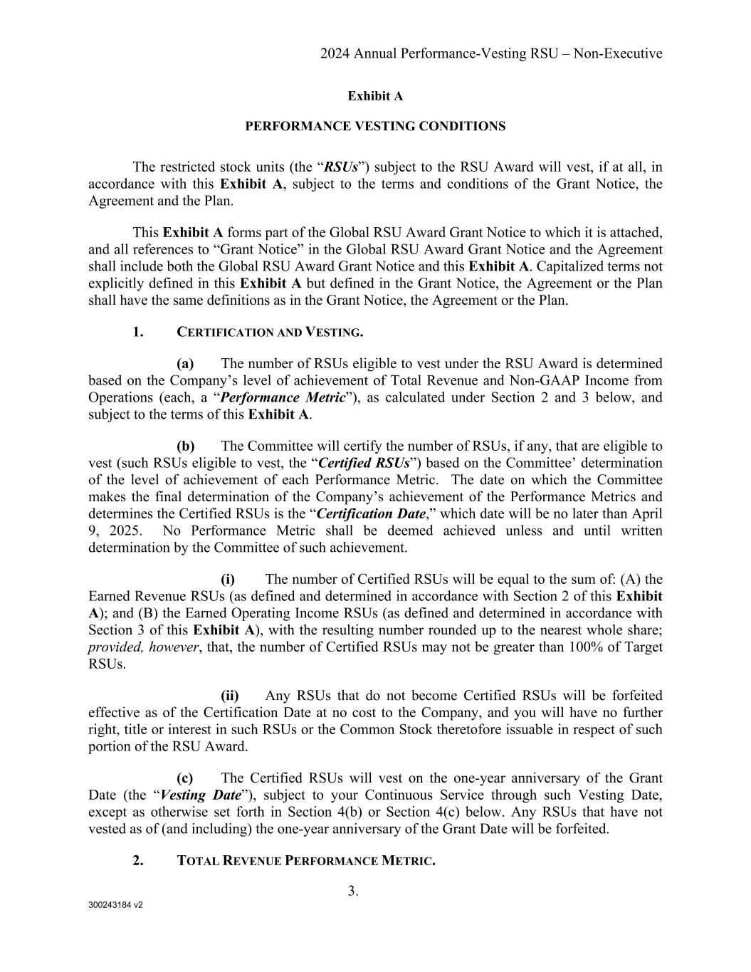 300243184 v2 2024 Annual Performance-Vesting RSU – Non-Executive 3. Exhibit A PERFORMANCE VESTING CONDITIONS The restricted stock units (the “RSUs”) subject to the RSU Award will vest, if at all, in accordance with this Exhibit A, subject to the terms and conditions of the Grant Notice, the Agreement and the Plan. This Exhibit A forms part of the Global RSU Award Grant Notice to which it is attached, and all references to “Grant Notice” in the Global RSU Award Grant Notice and the Agreement shall include both the Global RSU Award Grant Notice and this Exhibit A. Capitalized terms not explicitly defined in this Exhibit A but defined in the Grant Notice, the Agreement or the Plan shall have the same definitions as in the Grant Notice, the Agreement or the Plan. 1. CERTIFICATION AND VESTING. (a) The number of RSUs eligible to vest under the RSU Award is determined based on the Company’s level of achievement of Total Revenue and Non-GAAP Income from Operations (each, a “Performance Metric”), as calculated under Section 2 and 3 below, and subject to the terms of this Exhibit A. (b) The Committee will certify the number of RSUs, if any, that are eligible to vest (such RSUs eligible to vest, the “Certified RSUs”) based on the Committee’ determination of the level of achievement of each Performance Metric. The date on which the Committee makes the final determination of the Company’s achievement of the Performance Metrics and determines the Certified RSUs is the “Certification Date,” which date will be no later than April 9, 2025. No Performance Metric shall be deemed achieved unless and until written determination by the Committee of such achievement. (i) The number of Certified RSUs will be equal to the sum of: (A) the Earned Revenue RSUs (as defined and determined in accordance with Section 2 of this Exhibit A); and (B) the Earned Operating Income RSUs (as defined and determined in accordance with Section 3 of this Exhibit A), with the resulting number rounded up to the nearest whole share; provided, however, that, the number of Certified RSUs may not be greater than 100% of Target RSUs. (ii) Any RSUs that do not become Certified RSUs will be forfeited effective as of the Certification Date at no cost to the Company, and you will have no further right, title or interest in such RSUs or the Common Stock theretofore issuable in respect of such portion of the RSU Award. (c) The Certified RSUs will vest on the one-year anniversary of the Grant Date (the “Vesting Date”), subject to your Continuous Service through such Vesting Date, except as otherwise set forth in Section 4(b) or Section 4(c) below. Any RSUs that have not vested as of (and including) the one-year anniversary of the Grant Date will be forfeited. 2. TOTAL REVENUE PERFORMANCE METRIC.