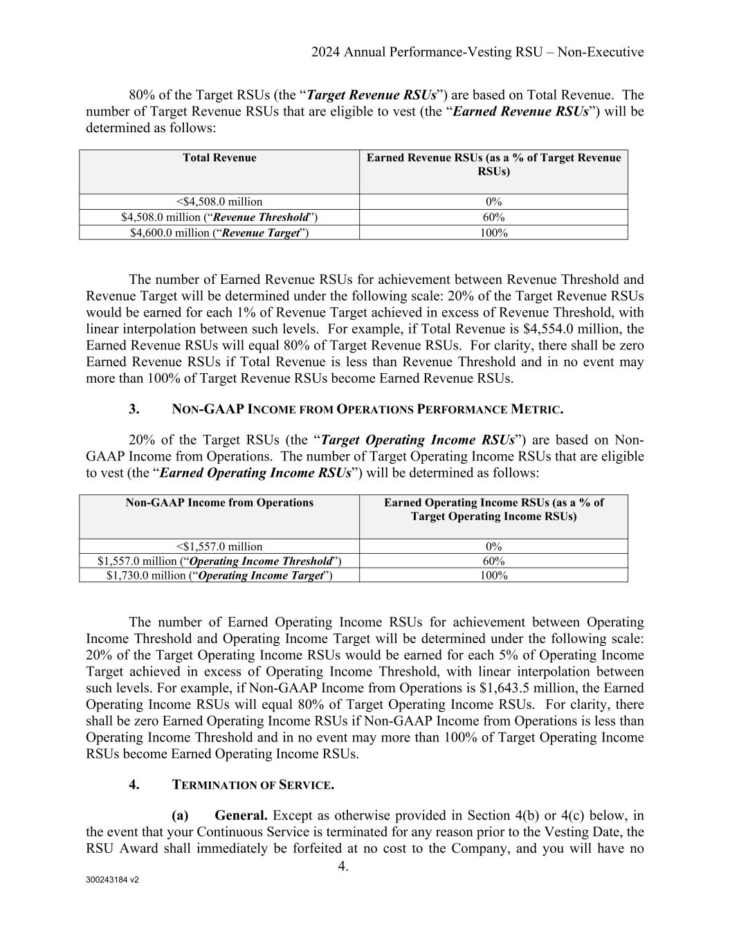 300243184 v2 2024 Annual Performance-Vesting RSU – Non-Executive 4. 80% of the Target RSUs (the “Target Revenue RSUs”) are based on Total Revenue. The number of Target Revenue RSUs that are eligible to vest (the “Earned Revenue RSUs”) will be determined as follows: Total Revenue Earned Revenue RSUs (as a % of Target Revenue RSUs) <$4,508.0 million 0% $4,508.0 million (“Revenue Threshold”) 60% $4,600.0 million (“Revenue Target”) 100% The number of Earned Revenue RSUs for achievement between Revenue Threshold and Revenue Target will be determined under the following scale: 20% of the Target Revenue RSUs would be earned for each 1% of Revenue Target achieved in excess of Revenue Threshold, with linear interpolation between such levels. For example, if Total Revenue is $4,554.0 million, the Earned Revenue RSUs will equal 80% of Target Revenue RSUs. For clarity, there shall be zero Earned Revenue RSUs if Total Revenue is less than Revenue Threshold and in no event may more than 100% of Target Revenue RSUs become Earned Revenue RSUs. 3. NON-GAAP INCOME FROM OPERATIONS PERFORMANCE METRIC. 20% of the Target RSUs (the “Target Operating Income RSUs”) are based on Non- GAAP Income from Operations. The number of Target Operating Income RSUs that are eligible to vest (the “Earned Operating Income RSUs”) will be determined as follows: Non-GAAP Income from Operations Earned Operating Income RSUs (as a % of Target Operating Income RSUs) <$1,557.0 million 0% $1,557.0 million (“Operating Income Threshold”) 60% $1,730.0 million (“Operating Income Target”) 100% The number of Earned Operating Income RSUs for achievement between Operating Income Threshold and Operating Income Target will be determined under the following scale: 20% of the Target Operating Income RSUs would be earned for each 5% of Operating Income Target achieved in excess of Operating Income Threshold, with linear interpolation between such levels. For example, if Non-GAAP Income from Operations is $1,643.5 million, the Earned Operating Income RSUs will equal 80% of Target Operating Income RSUs. For clarity, there shall be zero Earned Operating Income RSUs if Non-GAAP Income from Operations is less than Operating Income Threshold and in no event may more than 100% of Target Operating Income RSUs become Earned Operating Income RSUs. 4. TERMINATION OF SERVICE. (a) General. Except as otherwise provided in Section 4(b) or 4(c) below, in the event that your Continuous Service is terminated for any reason prior to the Vesting Date, the RSU Award shall immediately be forfeited at no cost to the Company, and you will have no