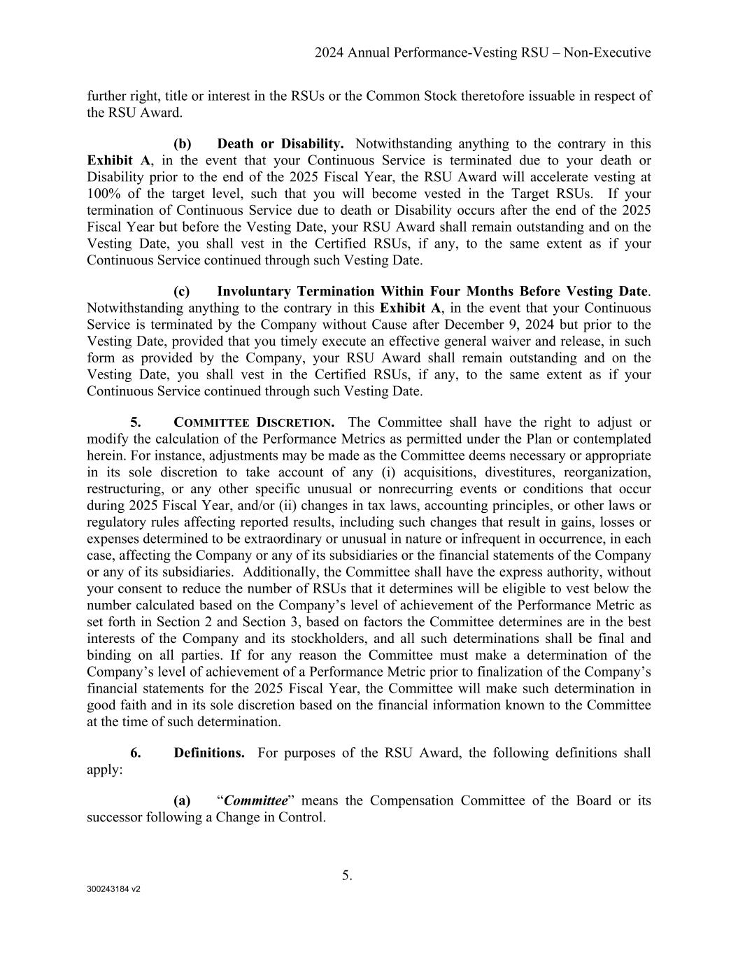 300243184 v2 2024 Annual Performance-Vesting RSU – Non-Executive 5. further right, title or interest in the RSUs or the Common Stock theretofore issuable in respect of the RSU Award. (b) Death or Disability. Notwithstanding anything to the contrary in this Exhibit A, in the event that your Continuous Service is terminated due to your death or Disability prior to the end of the 2025 Fiscal Year, the RSU Award will accelerate vesting at 100% of the target level, such that you will become vested in the Target RSUs. If your termination of Continuous Service due to death or Disability occurs after the end of the 2025 Fiscal Year but before the Vesting Date, your RSU Award shall remain outstanding and on the Vesting Date, you shall vest in the Certified RSUs, if any, to the same extent as if your Continuous Service continued through such Vesting Date. (c) Involuntary Termination Within Four Months Before Vesting Date. Notwithstanding anything to the contrary in this Exhibit A, in the event that your Continuous Service is terminated by the Company without Cause after December 9, 2024 but prior to the Vesting Date, provided that you timely execute an effective general waiver and release, in such form as provided by the Company, your RSU Award shall remain outstanding and on the Vesting Date, you shall vest in the Certified RSUs, if any, to the same extent as if your Continuous Service continued through such Vesting Date. 5. COMMITTEE DISCRETION. The Committee shall have the right to adjust or modify the calculation of the Performance Metrics as permitted under the Plan or contemplated herein. For instance, adjustments may be made as the Committee deems necessary or appropriate in its sole discretion to take account of any (i) acquisitions, divestitures, reorganization, restructuring, or any other specific unusual or nonrecurring events or conditions that occur during 2025 Fiscal Year, and/or (ii) changes in tax laws, accounting principles, or other laws or regulatory rules affecting reported results, including such changes that result in gains, losses or expenses determined to be extraordinary or unusual in nature or infrequent in occurrence, in each case, affecting the Company or any of its subsidiaries or the financial statements of the Company or any of its subsidiaries. Additionally, the Committee shall have the express authority, without your consent to reduce the number of RSUs that it determines will be eligible to vest below the number calculated based on the Company’s level of achievement of the Performance Metric as set forth in Section 2 and Section 3, based on factors the Committee determines are in the best interests of the Company and its stockholders, and all such determinations shall be final and binding on all parties. If for any reason the Committee must make a determination of the Company’s level of achievement of a Performance Metric prior to finalization of the Company’s financial statements for the 2025 Fiscal Year, the Committee will make such determination in good faith and in its sole discretion based on the financial information known to the Committee at the time of such determination. 6. Definitions. For purposes of the RSU Award, the following definitions shall apply: (a) “Committee” means the Compensation Committee of the Board or its successor following a Change in Control.