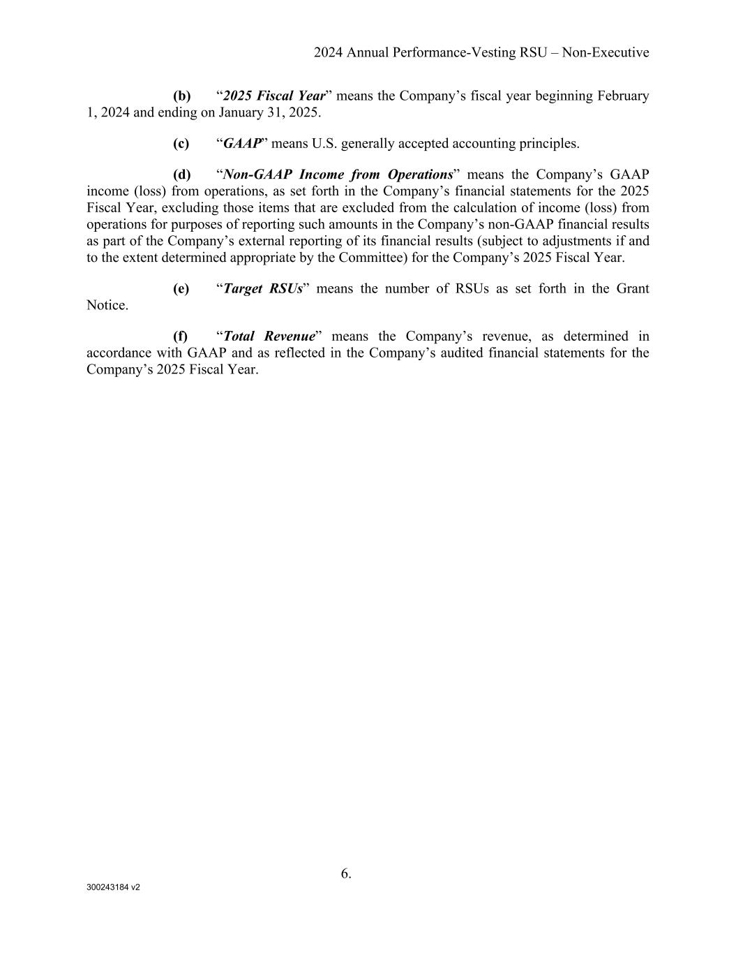 300243184 v2 2024 Annual Performance-Vesting RSU – Non-Executive 6. (b) “2025 Fiscal Year” means the Company’s fiscal year beginning February 1, 2024 and ending on January 31, 2025. (c) “GAAP” means U.S. generally accepted accounting principles. (d) “Non-GAAP Income from Operations” means the Company’s GAAP income (loss) from operations, as set forth in the Company’s financial statements for the 2025 Fiscal Year, excluding those items that are excluded from the calculation of income (loss) from operations for purposes of reporting such amounts in the Company’s non-GAAP financial results as part of the Company’s external reporting of its financial results (subject to adjustments if and to the extent determined appropriate by the Committee) for the Company’s 2025 Fiscal Year. (e) “Target RSUs” means the number of RSUs as set forth in the Grant Notice. (f) “Total Revenue” means the Company’s revenue, as determined in accordance with GAAP and as reflected in the Company’s audited financial statements for the Company’s 2025 Fiscal Year.