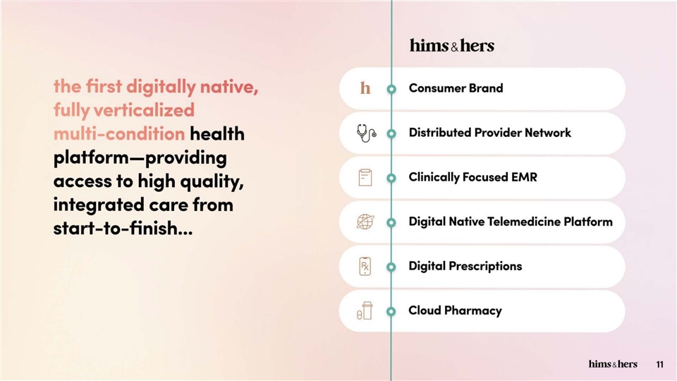 hims&hers Consumer Brand the first digitally native, h fully verticalized Distributed Provider Network multi-condition health platform-providing Clinically Focused EMR access to high quality, integrated care from Digital Native Telemedicine Platform start-to-finish ... sTI Cloud Pharmacy hims &hers 11 hims&hers Consumer Brand the first digitally native, h fully verticalized Distributed Provider Network multi-condition health platform-providing Clinically Focused EMR access to high quality, integrated care from Digital Native Telemedicine Platform start-to-finish ... sTI Cloud Pharmacy hims &hers 11