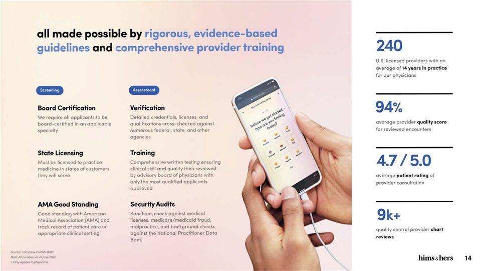 all made possible by rigorous, evidence-based guidelines and comprehensive provider training 240 U.S. licensed providers with an average of 14 years in practice for our physicians Board Certification Verification 94% Detailed credentials, licenses, and We require all applicants to be average provider quality score qualifications cross-checked against board-certified in an applicable for reviewed encounters federal, state, and other specialty numerous agencies Training State Licensing Must be licensed to practice Comprehensive written testing ensuring 4.7 I 5.0 medicine in states of customers clinical skill and quality then reviewed they will serve by advisory board of physicians with average patient rating of only the most qualified applicants provider consultation approved AMA Good Standing Security Audits Sanctions check against medical Good standing with American 9k+ licenses, medicare/medicaid fraud, Medical Association (AMA) and malpractice, and background checks track record of patient care in quality control provider chart against the National Practitioner Data appropriate clinical setting' reviews Bank Source: Company in/l}rno/ doto Note: All numbers as of june 2020 hims&hers 14 I. Only applies to physiCians all made possible by rigorous, evidence-based guidelines and comprehensive provider training 240 U.S. licensed providers with an average of 14 years in practice for our physicians Board Certification Verification 94% Detailed credentials, licenses, and We require all applicants to be average provider quality score qualifications cross-checked against board-certified in an applicable for reviewed encounters federal, state, and other specialty numerous agencies Training State Licensing Must be licensed to practice Comprehensive written testing ensuring 4.7 I 5.0 medicine in states of customers clinical skill and quality then reviewed they will serve by advisory board of physicians with average patient rating of only the most qualified applicants provider consultation approved AMA Good Standing Security Audits Sanctions check against medical Good standing with American 9k+ licenses, medicare/medicaid fraud, Medical Association (AMA) and malpractice, and background checks track record of patient care in quality control provider chart against the National Practitioner Data appropriate clinical setting' reviews Bank Source: Company in/l}rno/ doto Note: All numbers as of june 2020 hims&hers 14 I. Only applies to physiCians