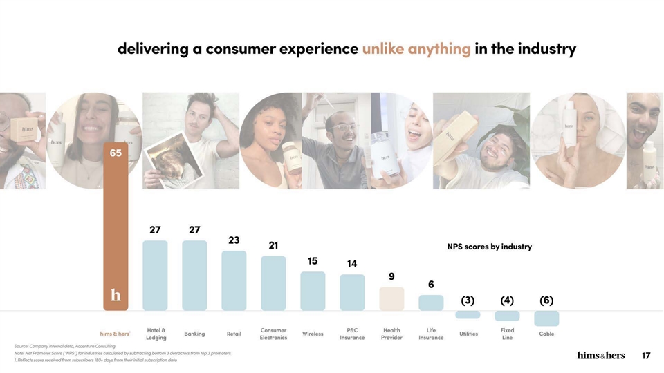 delivering a consumer experience unlike anything in the industry 23 21 NPS scores by industry 15 14 9 6 (3) (4) (6) Fixed Hotel & Consumer P&C Health Life Utilities hims & hers Banking Retail Wireless Cable Lodging Electronics Insurance Provider Insurance Line Source: Company internal data, Accenture Consulting Note: Net Promoter Score ('NPS ) for industries calculatod by subtracting bottom 3 detractors from top 3 promoters hims&hers 17 1. Reflocts scoro received from subscribers 180+ days from their initial subscription date delivering a consumer experience unlike anything in the industry 23 21 NPS scores by industry 15 14 9 6 (3) (4) (6) Fixed Hotel & Consumer P&C Health Life Utilities hims & hers Banking Retail Wireless Cable Lodging Electronics Insurance Provider Insurance Line Source: Company internal data, Accenture Consulting Note: Net Promoter Score ('NPS ) for industries calculatod by subtracting bottom 3 detractors from top 3 promoters hims&hers 17 1. Reflocts scoro received from subscribers 180+ days from their initial subscription date