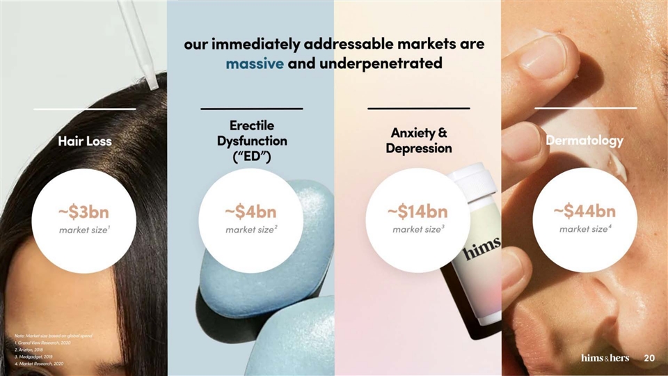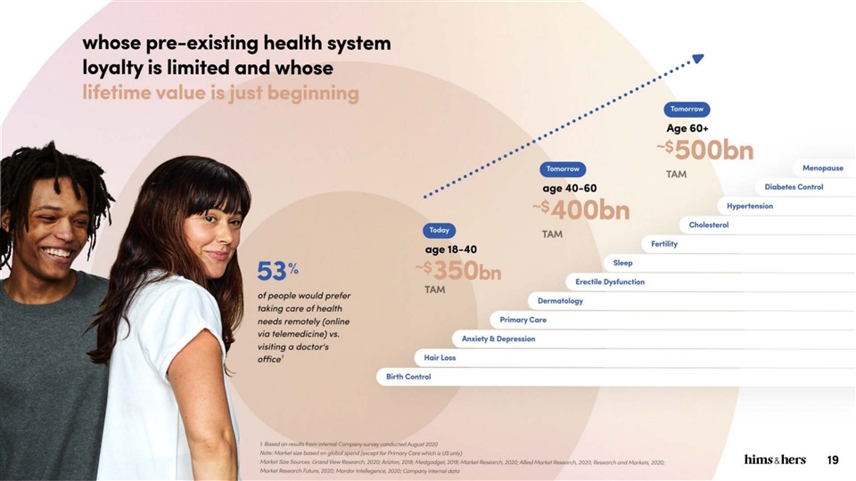 whose pre-existing health system .Y •• loyalty is limited and whose •• •• •• •• lifetime value is · •• •• •• •• •• •• Age 60+ •• •• •• •• •• Obn •• •• Menopause •• TAM • •• Diabetes Control •• age 40-60 •• • Hypertension n Cholesterol TAM Fertility age18-40 Sleep n Erectile Dysfunc:tion TAM of people would prefer Dermatology taking care of health Primary Care needs remotely (online via telemedicine) vs. Anxiety & Depression visiting a doctor's Hair loss office' Birth Control 1. Bosod on results from mternol C<>mpony survey conducted August 2020 Note: Markot size based on global spqnd (except for PrimaryC<>ro which is US only) hims&hers 19 Marlwt Sizo Sources: Grand View Research. 2020; Arizton, 2018; Medgadget, 2019; Market Research. 2020; Allied Market Resoarch, 2020; Research and Marlcols, 2020; Market Rosoarch Future, 2020, Mordor lntellogonce. 2020; C<>mpony internal data whose pre-existing health system .Y •• loyalty is limited and whose •• •• •• •• lifetime value is · •• •• •• •• •• •• Age 60+ •• •• •• •• •• Obn •• •• Menopause •• TAM • •• Diabetes Control •• age 40-60 •• • Hypertension n Cholesterol TAM Fertility age18-40 Sleep n Erectile Dysfunc:tion TAM of people would prefer Dermatology taking care of health Primary Care needs remotely (online via telemedicine) vs. Anxiety & Depression visiting a doctor's Hair loss office' Birth Control 1. Bosod on results from mternol C<>mpony survey conducted August 2020 Note: Markot size based on global spqnd (except for PrimaryC<>ro which is US only) hims&hers 19 Marlwt Sizo Sources: Grand View Research. 2020; Arizton, 2018; Medgadget, 2019; Market Research. 2020; Allied Market Resoarch, 2020; Research and Marlcols, 2020; Market Rosoarch Future, 2020, Mordor lntellogonce. 2020; C<>mpony internal data