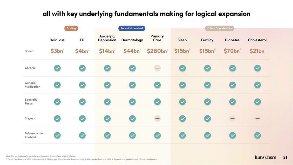all with key underlying fundamentals making for logical expansion Recently Launched Future Opportunities Anxiety& Primary Hair Loss ED Depression Dermatology Care Sleep Fertility Diabetes Cholesterol 4 1 5 Spend $44bn $280bn $15bn $21bn Chronic • • • • • • • • Generic Medication • • • • • • • • • Specialty Focus • • • Stigma • • • • • • Telemedicine Enabled • • • • • • • • Note: Markel size based on global spend (except for Primary Care which is US only) hims&hers 21 1. Grand View Research, 2020; 2. Arizton, 2018; 3. Medgadgol, 2019; 4. Market Research, 2020; 5. Allied Market Research, 2020; 6. Research and Markets, 2020; 7. Mordor Intelligence all with key underlying fundamentals making for logical expansion Recently Launched Future Opportunities Anxiety& Primary Hair Loss ED Depression Dermatology Care Sleep Fertility Diabetes Cholesterol 4 1 5 Spend $44bn $280bn $15bn $21bn Chronic • • • • • • • • Generic Medication • • • • • • • • • Specialty Focus • • • Stigma • • • • • • Telemedicine Enabled • • • • • • • • Note: Markel size based on global spend (except for Primary Care which is US only) hims&hers 21 1. Grand View Research, 2020; 2. Arizton, 2018; 3. Medgadgol, 2019; 4. Market Research, 2020; 5. Allied Market Research, 2020; 6. Research and Markets, 2020; 7. Mordor Intelligence
