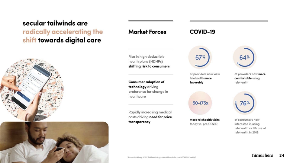 secular tailwinds are COVID-19 radically accelerating the Market Forces shift towards digital care Rise in high deductible health plans (HDHPs) • shifting risk to consumers of providers now view of providers now more telehealth more comfortable using Consumer adoption of favorably telehealth technology driving preference for change in healthcare 50-175x Rapidly increasing medical costs driving need for price of consumers now more telehealth visits transparency today vs. pre COVID interested in using telehealth vs 11% use of telehealth in 2019 hims&hers 24 Source: McKinsey, 2020, Tolehco/th: A quorler-tril/ion-dol/ar pcst-COV/D-19 reality? secular tailwinds are COVID-19 radically accelerating the Market Forces shift towards digital care Rise in high deductible health plans (HDHPs) • shifting risk to consumers of providers now view of providers now more telehealth more comfortable using Consumer adoption of favorably telehealth technology driving preference for change in healthcare 50-175x Rapidly increasing medical costs driving need for price of consumers now more telehealth visits transparency today vs. pre COVID interested in using telehealth vs 11% use of telehealth in 2019 hims&hers 24 Source: McKinsey, 2020, Tolehco/th: A quorler-tril/ion-dol/ar pcst-COV/D-19 reality?