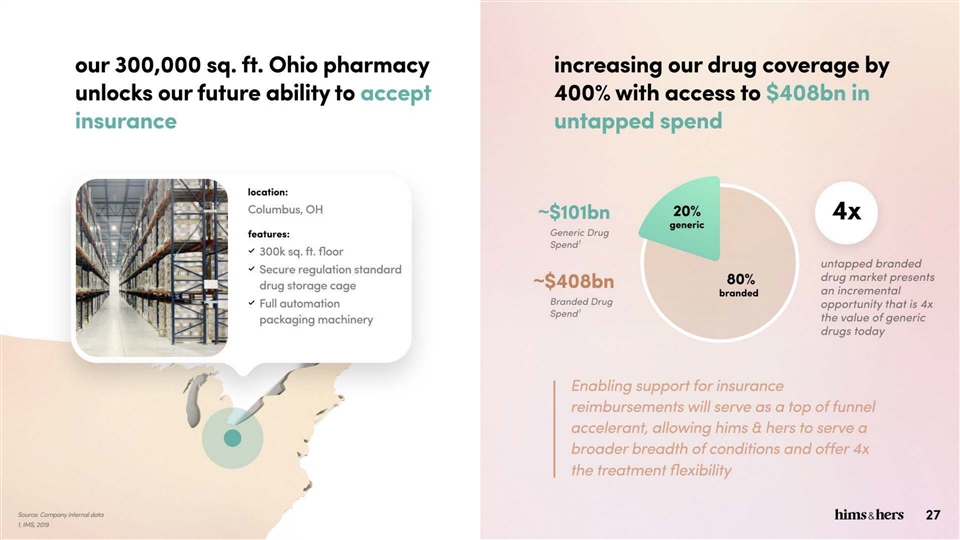 our 300,000 sq. ft. Ohio pharmacy increasing our drug coverage by unlocks our future ability to accept 400% with access to $408bn in • Insurance untapped spend location: Columbus, OH 20% -$101bn 4x generic Generic Drug features: Spend' ' 300k sq. ft. floor untapped branded ' Secure regulation standard drug market presents 80% -$408bn drug storage cage an incremental branded Branded Drug ' Full automation that is 4x opportunity Spend' the value of generic packaging machinery drugs today Enabling support for insurance reimbursements will serve as a top of funnel accelerant, allowing hims 8: hers to serve a broader breadth of conditions and offer 4x the treatment flexibility Source: Company internal data hims &hers 27 I. IMS. 2019 our 300,000 sq. ft. Ohio pharmacy increasing our drug coverage by unlocks our future ability to accept 400% with access to $408bn in • Insurance untapped spend location: Columbus, OH 20% -$101bn 4x generic Generic Drug features: Spend' ' 300k sq. ft. floor untapped branded ' Secure regulation standard drug market presents 80% -$408bn drug storage cage an incremental branded Branded Drug ' Full automation that is 4x opportunity Spend' the value of generic packaging machinery drugs today Enabling support for insurance reimbursements will serve as a top of funnel accelerant, allowing hims 8: hers to serve a broader breadth of conditions and offer 4x the treatment flexibility Source: Company internal data hims &hers 27 I. IMS. 2019