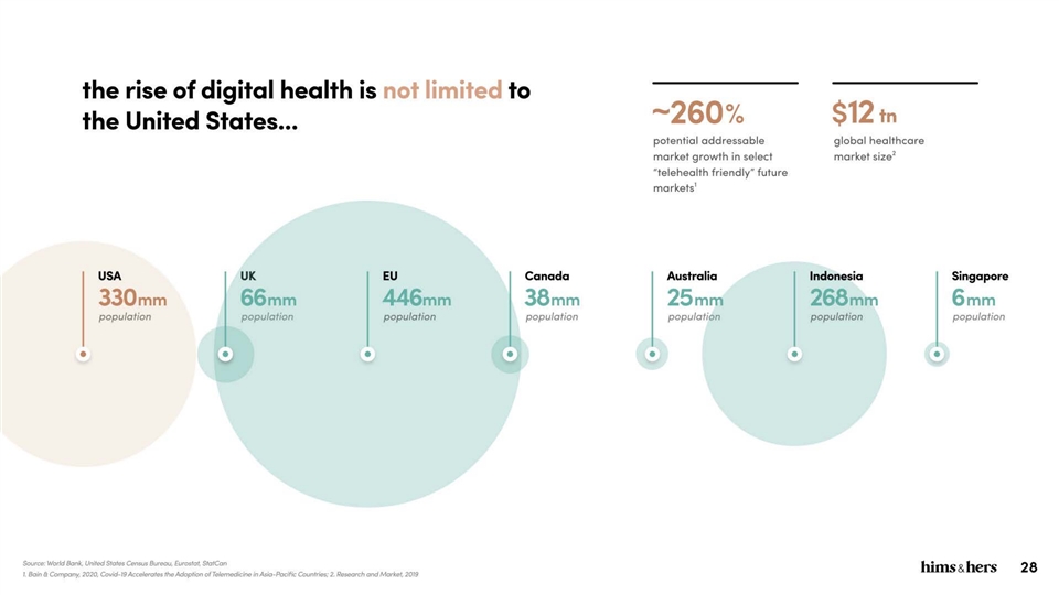 the rise of digital health is not limited to ~260% $12tn the United States ... potential addressable global healthcare 2 market growth in select market size telehealth friendly future 1 markets USA UK EU Canada Australia Indonesia Singapore 330mm 66mm 446mm 38mm 25mm 268mm 6mm population population population population population population population • • • • • • Source: World Bank, United States Census Bureau, Eurostat, StatCan hims&hers 28 1. Bain a Company. 2020, Covid- 19 Accelerates the Adoption of Te/emedicine in Asia-Pacific Countries; 2. Research and Market, 2019 the rise of digital health is not limited to ~260% $12tn the United States ... potential addressable global healthcare 2 market growth in select market size telehealth friendly future 1 markets USA UK EU Canada Australia Indonesia Singapore 330mm 66mm 446mm 38mm 25mm 268mm 6mm population population population population population population population • • • • • • Source: World Bank, United States Census Bureau, Eurostat, StatCan hims&hers 28 1. Bain a Company. 2020, Covid- 19 Accelerates the Adoption of Te/emedicine in Asia-Pacific Countries; 2. Research and Market, 2019