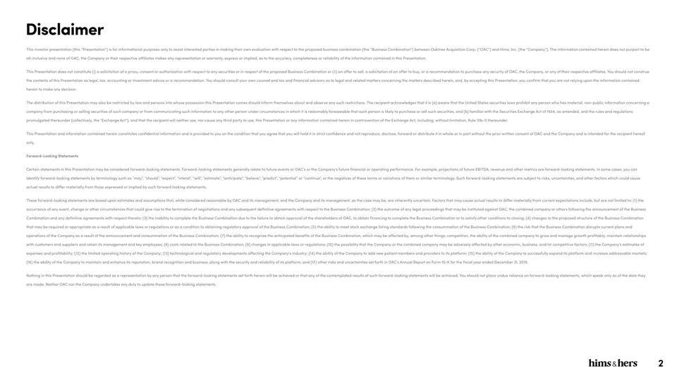 Disclaimer This investor presentation (this Presentation ') is for informational purposes only to assist interested parties in mokmg their own evaluation wdh respect to the proposed business combination (the ~Business Combination ) between Oak tree Acquisihon Corp. ( OAC} and Hims, Inc. (the Company} . The informat1on contained herein does not purport to be oll-mclus•ve and none of OAC, the Company or their respective affiliates makes any representohon or warranty, express or implied, as to the occurocy, completeness or reliob•lity of the information contained in this Presentation. This Presentation does not constitute (i) o solicitation of o proxy, consent or outhorizof1on with respect to any securihes or in respect of the proposed Business Combination or (ii) on offer to sell, o solicitohon of on offer to buy, or a recommend chon to purchase any security of OAC, the Company, or any of their respective affiliates. You shotJid not construe the contents of th1s Presentation as legal. tax. occounhng or investment advice oro recommendation. You should consult your own counsel and tax and financial advisors as to legal and related matters concerning the matters descnbed herein, and, by accepting this Presentation, you confirm that you ore not relying upon the information contained herein to make any deciston. The distnbution of this Presentation may also be restricted by low and persons into whose possess1on th1s Presentation comes should inform themselves about and observe any such restncflons. The rectpient acknowledges that it is (a) aware that the United States securd•es lows proh1bit any person who has motenol. non-pubhc information concerning o company from purchasing or selhng securihes of such compony or from commun1coting such informohon to any other person under circumstances in which it is reasonably foreseeable that such person •s likely to purchase or sell such securities. and (b) familiar with the Securities Exchange Act of 1934, as amended, and the rules and regulations promulgated thereunder (collectively, the Exchange Act''), and that the rec1p1ent will neither use, nor cause any th~rd party to use, this Presentation or any information contained herein in contravention of the Exchange Act. mcluding, without ltmitation, Rule lOb-S thereunder. Th is Presentation and mformotion contained herein constitutes confidential informohon and is provided to you on the cond1tion that you agree that you will hold it in strict confidence and not reproduce, disclose, forward or d1stribute it in whole or in port without the prtor written consent of OAC and the Company and IS intended for the recipient hereof only. Forward-Looking Statements Certain statements in th1s Presentation may be considered forword-lookmg statements. Forward-looking statements generally relate to future events or OAC's or the Company's future financial or operating performance. For example, projections of future EBITOA. revenue and other metrics ore forward-looking statements. In some cases, you con identify forword-look1ng statements by termmology such as may , should': expect': intend': will': eshmote , onticipote': believe~, 'predict': potential or continue , or the negatives of these terms or vor1at1ons of them or s1milor terminology. Such forward-looking statements ore subject to risks, uncerto1nties, and other factors which could cause actual results to differ materially from those expressed or imphed by such forward looking statements. These forward-looking statements ore based upon estimates and assumptions that, while considered reasonable by OAC and its management, and the Company and its management. as the case may be, ore inherently uncertain. Factors that may cause actual results to differ materially from current expectations include, but ore not limited to: (1) the occurrence of any event, change o r other ctrcumstonces tha t could give rise to the terminohon of negotiations and any subsequent definitive agreements w1th respect to the Business Combination; {2) the outcome of any legal proceedings tha t may be instituted against OAC, the combined company or others following the announcement of the Business Combination and any definitive agreements with respect thereto; (3) the inobihty to complete the Business Combination due to the failure to obtain approval of the shareholders of OAC, to obtain finoncmg to complete the Business Combination or to satisfy other condrtions to closing; (4) changes to the proposed structure of the Business Combination that may be required or appropriate as o result of applicable lows or regulations or as o condition to obta1ning regulatory approval of the Business Comb1notion; (5) the obihty to meet stock exchange listmg standards following the consummation of the Business Combination; (6) the risk that the Bus1ness Combmahon d•srupts current pions and operahons of the Company as o result of the announcement and consummation of the Business Comb1notion; (7) the obiltty to recognize the anticipated benefits of the Business Combmotion, which may be affected by, among other things, competition, the ab1hty of the combined company to grow and manage growth profitably, maintain relohonships wdh customers and suppliers and retain its management and key employees; (8) costs related to the Business Combination; (9) changes in opphcoble lows or regulations; (10) the possibility thot the Company or the combined company may be adversely affected by other econom1c, business, and/or competitive factors; {II) the Company's estimates of expenses and profitability; (12) the limited operating history of the Company; {13) technological and regulatory developments affecting the Company's industry; (14) the ability of the Company to odd new patient members and providers to its platform; {15) the ability of the Company to successfully expand its platform and •ncreose addressable morkets; {16) the ability of the Company to mo1nto1n and enhance its reputation, brand recognrtion and busi