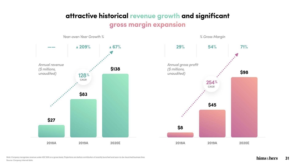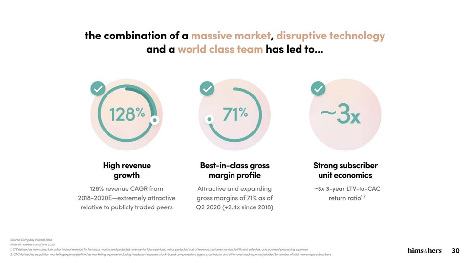 the combination of a massive market, disruptive technology and a world class team has led to ... 71% 128% -3x Best-in-class gross High revenue Strong subscriber growth margin profile unit economics 128% revenue CAGR from -3x 3-year LTV-to-CAC Attractive and expanding 1 2 ratio 2018-2020E-extremely attractive gross margins of 71% as of return relative to publicly traded peers 02 2020 ( +2.4x since 2018) Source: Company internal data Nato: All numbers as of june 2020 I. LTV defined as new subscriber cohort actual revenue for historical months and projected revenue for future periods, minus projected cost of rovonue, customer service, fulfillment, sales tax, and payment processing expenses hims&hers 30 2. CAC defined as acquisition marketing expense (dofined as marketing expense excluding heodcount expense, stock-based compensation. agency, contractor and other overhead expenses) divided by number of total new unique subscribers the combination of a massive market, disruptive technology and a world class team has led to ... 71% 128% -3x Best-in-class gross High revenue Strong subscriber growth margin profile unit economics 128% revenue CAGR from -3x 3-year LTV-to-CAC Attractive and expanding 1 2 ratio 2018-2020E-extremely attractive gross margins of 71% as of return relative to publicly traded peers 02 2020 ( +2.4x since 2018) Source: Company internal data Nato: All numbers as of june 2020 I. LTV defined as new subscriber cohort actual revenue for historical months and projected revenue for future periods, minus projected cost of rovonue, customer service, fulfillment, sales tax, and payment processing expenses hims&hers 30 2. CAC defined as acquisition marketing expense (dofined as marketing expense excluding heodcount expense, stock-based compensation. agency, contractor and other overhead expenses) divided by number of total new unique subscribers