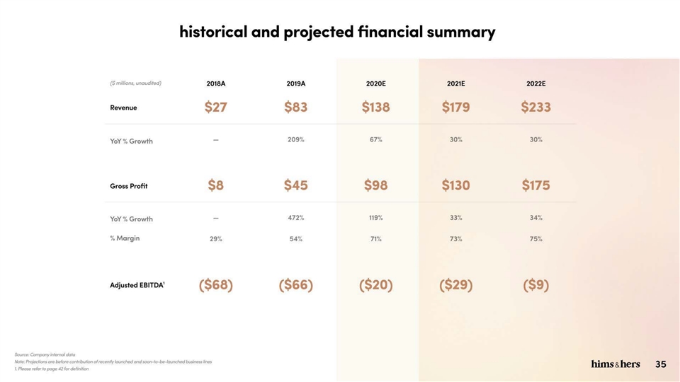 historical and projected financial summary ($ millions, unaudited) 2018A 2019A 2020E 2021E 2022E Revenue $27 $83 $138 $179 $233 30'}'. 30'}'. 209'}'. 67'Y. YoY 'Yo Growth Gross Profit $8 $45 $98 $130 $175 472'}'. 119'}'. 33'}'. 34'}'. YoY 'Yo Growth 'Y. Margin 29'}'. 54 'Yo 73'}'. 71 'Y. 75'Y. 1 Adjusted EBITDA ($68) ($66) ($20) ($29) ($9) Source: Company internal data Note: Projections oro before contribution of recently launched and soon-to-be- launched business lines hims &hers 35 1. Please refer to page 42 for definition historical and projected financial summary ($ millions, unaudited) 2018A 2019A 2020E 2021E 2022E Revenue $27 $83 $138 $179 $233 30'}'. 30'}'. 209'}'. 67'Y. YoY 'Yo Growth Gross Profit $8 $45 $98 $130 $175 472'}'. 119'}'. 33'}'. 34'}'. YoY 'Yo Growth 'Y. Margin 29'}'. 54 'Yo 73'}'. 71 'Y. 75'Y. 1 Adjusted EBITDA ($68) ($66) ($20) ($29) ($9) Source: Company internal data Note: Projections oro before contribution of recently launched and soon-to-be- launched business lines hims &hers 35 1. Please refer to page 42 for definition