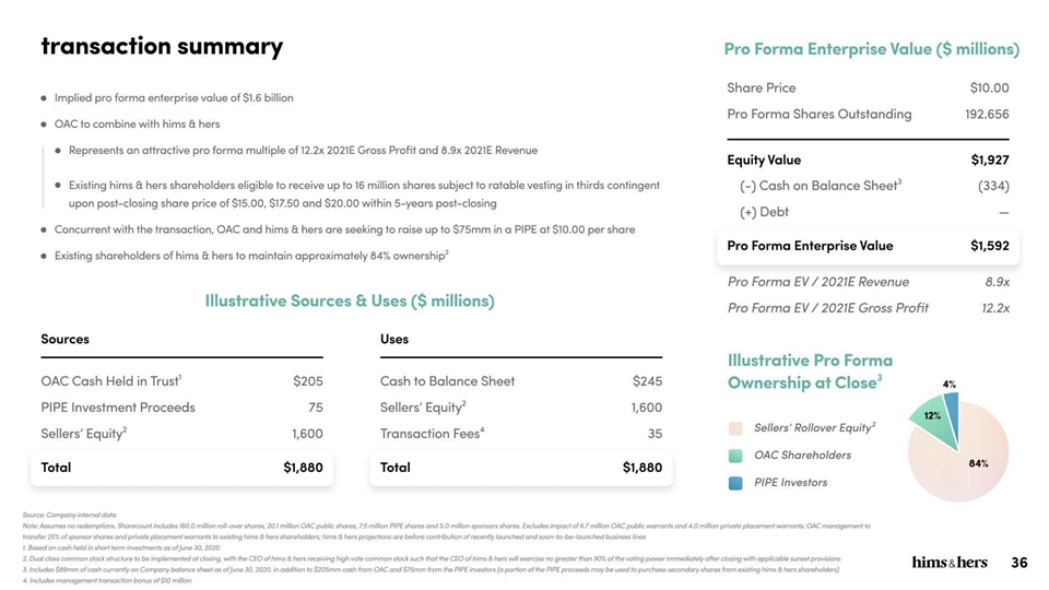 transaction summary Pro Forma Enterprise Value($ millions) Share Price $10.00 • Implied pro forma enterprise value of $1.6 billion Pro Forma Shares Outstanding 192.656 • OAC to combine with hims a hers • Represents an attractive pro forma multiple of 12.2x 2021E Gross Profit and 8.9x 2021E Revenue Equity Value $1,927 • Existing hims a hers shareholders eligible to receive up to 16 million shares subject to ratable vesting in thirds contingent (-) Cash on Balance Sheee (334) upon post-closing share price of $15.00, $17.50 and $20.00 within 5-years post-closing (+)Debt • Concurrent with the transaction, OAC and hims a hers are seeking to raise up to $75mm in a PIPE at $10.00 per share Pro Forma Enterprise Value $1,592 2 • Existing shareholders of hims a hers to maintain approximately 84% ownership Pro Forma EV I 2021E Revenue 8.9x Illustrative Sources & Uses($ millions) Pro Forma EV I 2021E Gross Profit 12.2x Sources Uses Illustrative Pro Forma 1 3 OAC Cash Held in Trust $205 Cash to Balance Sheet $245 4% Ownership at Close 2 1,600 PIPE Investment Proceeds 75 Sellers' Equity 2 Sellers' Rollover Equity 2 4 ·~~ 1,600 Sellers' Equity Transaction Fees 35 OAC Shareholders 84% Total $1,880 Total $1,880 PIPE Investors • Source: Company internal data Note: Assumes no redemptions. Sharecount includes 160.0 million roll-over shares, 20.1 million OAC public shares, 7.5 million PIPE shares and 5.0 million sponsors shares. Excludes impact of 6.7 million OAC public warronts and 4.0 million private p/ocement warrants; OAC management to transfer 25% of sponsor shares and private placement warrants to existing hims 8 hers shareholders; hims a hers projections are before contribution of recently launched and soon-to-be-launched business lines 1. Based on cash held in short term investments as of june 30, 2020 2. Dual class common stock structure to be implemented at closing, with the CEO of hims ll hers receiving high vote common stock such that the CEO of hims ll hers will exercise no greater than 90% of the voting power immediately after closing with applicable sunset provisions hims&hers 36 3. Includes $89mm of cash currentiy on Company balance sheet as of june 30, 2020, in addition to $205mm cash from OAC and $75mm from the PIPE investors (a portion of the PIPE proceeds may be used to purchase secondary shares from existing hims ll hers shareholders) 4. Includes management transaction bonus of $70 million transaction summary Pro Forma Enterprise Value($ millions) Share Price $10.00 • Implied pro forma enterprise value of $1.6 billion Pro Forma Shares Outstanding 192.656 • OAC to combine with hims a hers • Represents an attractive pro forma multiple of 12.2x 2021E Gross Profit and 8.9x 2021E Revenue Equity Value $1,927 • Existing hims a hers shareholders eligible to receive up to 16 million shares subject to ratable vesting in thirds contingent (-) Cash on Balance Sheee (334) upon post-closing share price of $15.00, $17.50 and $20.00 within 5-years post-closing (+)Debt • Concurrent with the transaction, OAC and hims a hers are seeking to raise up to $75mm in a PIPE at $10.00 per share Pro Forma Enterprise Value $1,592 2 • Existing shareholders of hims a hers to maintain approximately 84% ownership Pro Forma EV I 2021E Revenue 8.9x Illustrative Sources & Uses($ millions) Pro Forma EV I 2021E Gross Profit 12.2x Sources Uses Illustrative Pro Forma 1 3 OAC Cash Held in Trust $205 Cash to Balance Sheet $245 4% Ownership at Close 2 1,600 PIPE Investment Proceeds 75 Sellers' Equity 2 Sellers' Rollover Equity 2 4 ·~~ 1,600 Sellers' Equity Transaction Fees 35 OAC Shareholders 84% Total $1,880 Total $1,880 PIPE Investors • Source: Company internal data Note: Assumes no redemptions. Sharecount includes 160.0 million roll-over shares, 20.1 million OAC public shares, 7.5 million PIPE shares and 5.0 million sponsors shares. Excludes impact of 6.7 million OAC public warronts and 4.0 million private p/ocement warrants; OAC management to transfer 25% of sponsor shares and private placement warrants to existing hims 8 hers shareholders; hims a hers projections are before contribution of recently launched and soon-to-be-launched business lines 1. Based on cash held in short term investments as of june 30, 2020 2. Dual class common stock structure to be implemented at closing, with the CEO of hims ll hers receiving high vote common stock such that the CEO of hims ll hers will exercise no greater than 90% of the voting power immediately after closing with applicable sunset provisions hims&hers 36 3. Includes $89mm of cash currentiy on Company balance sheet as of june 30, 2020, in addition to $205mm cash from OAC and $75mm from the PIPE investors (a portion of the PIPE proceeds may be used to purchase secondary shares from existing hims ll hers shareholders) 4. Includes management transaction bonus of $70 million
