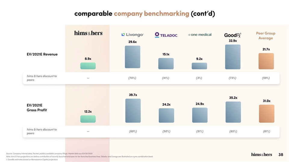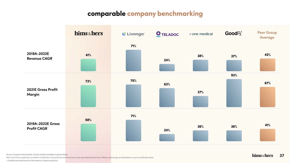 comparable company benchmarking 1 Peer Group hims& hers ~ Livongo• + one medical GoodB 2 TELADOC. Average 71% 2019A-2022E 42% 41% 38% 37% Revenue CAGR 24% 93% 75% 73% 67% 63% 2021E Gross Profit 37% Margin 71% 58% 2019A-2022E Gross 41% 36% 36% ProfitCAGR 24% Source: Company internal data, Factsot, publicly ovoiloblo company filings hims&hers 37 Nato: hims a hors projections are before contribution of recently launched and soon-to-be-launched business lines; Tolacloc and Uvongo are illustrated on a pre-combination basis 1. GoodRx estimates based on Rennaisance Capitol projections comparable company benchmarking 1 Peer Group hims& hers ~ Livongo• + one medical GoodB 2 TELADOC. Average 71% 2019A-2022E 42% 41% 38% 37% Revenue CAGR 24% 93% 75% 73% 67% 63% 2021E Gross Profit 37% Margin 71% 58% 2019A-2022E Gross 41% 36% 36% ProfitCAGR 24% Source: Company internal data, Factsot, publicly ovoiloblo company filings hims&hers 37 Nato: hims a hors projections are before contribution of recently launched and soon-to-be-launched business lines; Tolacloc and Uvongo are illustrated on a pre-combination basis 1. GoodRx estimates based on Rennaisance Capitol projections