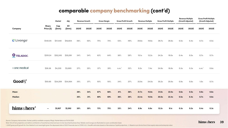 comparable company benchmarking (cont'd) Revenue Multiple Gross Profit Multiple Market Adj. Revenue Growth Gross Margin Gross Profit Growth Revenue Multiple Gross Profit Multiple (Growth Adjusted) (Growth Adjusted) Share Cap EV Company Price($) ($mm) ($mm) 2021E 2022E 2021E 2022E 2021E 2022E 2021E 2022E 2021E 2022E 2021E 2022E 2021E 2022E ~ Livongo· 56'}'. 50'}'. $140.05 $17,440 $16,604 75% 74'7. 53% 49'}'. 29.6x 19.6x 39.7x 26.6x 0.5x 0.4x 0.7x 0.5x $219.24 $20,245 $20,091 34'}'. 63'}'. 36'}'. 28'}'. 15.1x 12.2x 24.2x 19.0x 0.4x 0.5x 0.7x 0.7x 24% 64% 2 TELADOC. +one medical 27'}'. 25'}'. 39'}'. n.m.' 32'}'. n.m.' $28.36 $4,230 $3,885 37'7. 9.2x 7.4x 24.9x 18.8x 0.3x 0.3x 0.6x 35'}'. 37'}'. 93'}'. 93'}'. 34'}'. 37'}'. $55.60 $24,259 $24,064 32.9x 24.0x 35.2x 25.8x 0.9x 0.6x l.Ox 0.7x Mean 38'}'. 34% 67'}'. 68'}'. 41'}'. 36'}'. 21.7x 15.8x 31.0x 22.5x 0.6x 0.5x 0.8x 0.6x Median 35'}'. 31% 69'}'. 69'}'. 36'}'. 35'}'. 22.4x 15.9x 30.0x 22.4x 0.5x 0.4x 0.7x 0.6x 3 33'}'. $1,927 $1,592 30'}'. 30'}'. 73'}'. 75% 34% 8.9x 6.8x 12.2x 9.1x 0.3x 0.2x 0.4x 0.3x hims& hers Source: Company internal data, Factset. publicly available company filings; Market data as of 9/30/2020 hims&hers 39 Note: hims a hers projections are before contribution of recently launched and soon- to-be-launched business lines; Telocloc and Livongo are illustrated on a pre-combination basiS I. 2021£ gross profit growth for One Medical is not meaningful giV<>n the depressed state of 2020 financiols due to COV/D- 19; 2. Goodl?x estimates based on l?ennoisance Capital projections; 3. Based on pro forma hims a hers equity value and enterprise value comparable company benchmarking (cont'd) Revenue Multiple Gross Profit Multiple Market Adj. Revenue Growth Gross Margin Gross Profit Growth Revenue Multiple Gross Profit Multiple (Growth Adjusted) (Growth Adjusted) Share Cap EV Company Price($) ($mm) ($mm) 2021E 2022E 2021E 2022E 2021E 2022E 2021E 2022E 2021E 2022E 2021E 2022E 2021E 2022E ~ Livongo· 56'}'. 50'}'. $140.05 $17,440 $16,604 75% 74'7. 53% 49'}'. 29.6x 19.6x 39.7x 26.6x 0.5x 0.4x 0.7x 0.5x $219.24 $20,245 $20,091 34'}'. 63'}'. 36'}'. 28'}'. 15.1x 12.2x 24.2x 19.0x 0.4x 0.5x 0.7x 0.7x 24% 64% 2 TELADOC. +one medical 27'}'. 25'}'. 39'}'. n.m.' 32'}'. n.m.' $28.36 $4,230 $3,885 37'7. 9.2x 7.4x 24.9x 18.8x 0.3x 0.3x 0.6x 35'}'. 37'}'. 93'}'. 93'}'. 34'}'. 37'}'. $55.60 $24,259 $24,064 32.9x 24.0x 35.2x 25.8x 0.9x 0.6x l.Ox 0.7x Mean 38'}'. 34% 67'}'. 68'}'. 41'}'. 36'}'. 21.7x 15.8x 31.0x 22.5x 0.6x 0.5x 0.8x 0.6x Median 35'}'. 31% 69'}'. 69'}'. 36'}'. 35'}'. 22.4x 15.9x 30.0x 22.4x 0.5x 0.4x 0.7x 0.6x 3 33'}'. $1,927 $1,592 30'}'. 30'}'. 73'}'. 75% 34% 8.9x 6.8x 12.2x 9.1x 0.3x 0.2x 0.4x 0.3x hims& hers Source: Company internal data, Factset. publicly available company filings; Market data as of 9/30/2020 hims&hers 39 Note: hims a hers projections are before contribution of recently launched and soon- to-be-launched business lines; Telocloc and Livongo are illustrated on a pre-combination basiS I. 2021£ gross profit growth for One Medical is not meaningful giV<>n the depressed state of 2020 financiols due to COV/D- 19; 2. Goodl?x estimates based on l?ennoisance Capital projections; 3. Based on pro forma hims a hers equity value and enterprise value