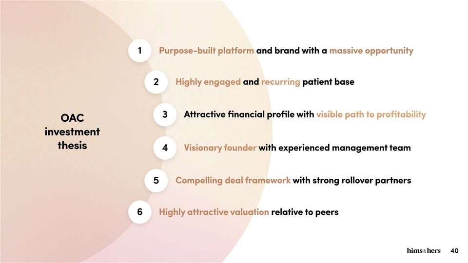 1 Purpose-built platform and brand with a massive opportunity Highly engaged and recurring patient base 2 Attractive financial profile with visible path to profitability 3 OAC investment thesis Visionary founder with experienced management team 4 5 Compelling deal framework with strong rollover partners 6 Highly attractive valuation relative to peers hims &hers 40 1 Purpose-built platform and brand with a massive opportunity Highly engaged and recurring patient base 2 Attractive financial profile with visible path to profitability 3 OAC investment thesis Visionary founder with experienced management team 4 5 Compelling deal framework with strong rollover partners 6 Highly attractive valuation relative to peers hims &hers 40