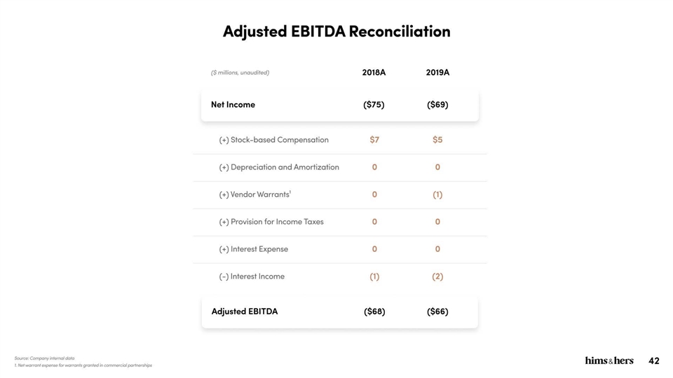 Adjusted EBITDA Reconciliation ($ millions, unaudited) 2018A 2019A Net Income ($75) ($69) ( +) Stock-based Compensation $7 $5 ( +) Depreciation and Amortization 0 0 1 (+)Vendor Warrants 0 (1) ( +) Provision for Income Taxes 0 0 ( +) Interest Expense 0 0 (-) Interest Income (1) (2) Adjusted EBITDA ($68) ($66) Source: Company internal data hims &hers 42 1. Net warrant expense for warrants granted in commercial partnerships Adjusted EBITDA Reconciliation ($ millions, unaudited) 2018A 2019A Net Income ($75) ($69) ( +) Stock-based Compensation $7 $5 ( +) Depreciation and Amortization 0 0 1 (+)Vendor Warrants 0 (1) ( +) Provision for Income Taxes 0 0 ( +) Interest Expense 0 0 (-) Interest Income (1) (2) Adjusted EBITDA ($68) ($66) Source: Company internal data hims &hers 42 1. Net warrant expense for warrants granted in commercial partnerships