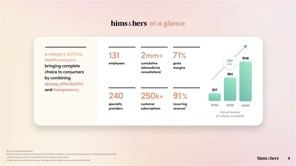 hims&hers t a glance • •• • • • a category defimng • • 2mm+ 71% 131 $138 ornrv,n I health 128% employees cumulative gross CAGR bringing complete telemedicine margins • • • 1 • consultations choice to consumers • • $83 • • by combining • • access, affordability $27 and transparency 240 250k+ 91% specialty customer recurring 2018A 2019A 2020E 2 providers subscriptions revenue Annual revenue ($ millions, unaudited) Source: Company internal data Note: All numbers as ofjune 2020; Projections are before contribution of recently launched and soan- to-be-launched business Jines I. Dflfincd as tho creation of a consultation ID in tho medical review system hims&hers 4 2. Recurring revenue defined as revenue from subscriptions during tho quarter ended June 30, 2020 hims&hers t a glance • •• • • • a category defimng • • 2mm+ 71% 131 $138 ornrv,n I health 128% employees cumulative gross CAGR bringing complete telemedicine margins • • • 1 • consultations choice to consumers • • $83 • • by combining • • access, affordability $27 and transparency 240 250k+ 91% specialty customer recurring 2018A 2019A 2020E 2 providers subscriptions revenue Annual revenue ($ millions, unaudited) Source: Company internal data Note: All numbers as ofjune 2020; Projections are before contribution of recently launched and soan- to-be-launched business Jines I. Dflfincd as tho creation of a consultation ID in tho medical review system hims&hers 4 2. Recurring revenue defined as revenue from subscriptions during tho quarter ended June 30, 2020