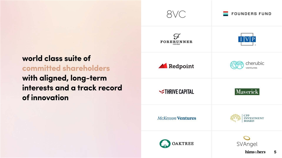 - FOUNDERS FUND 8VC FORERUNNER VI!H f UUS world class suite of ~ cherubic .M Redpoint ~ ventures committed shareholders aligned, long-term with interests and a track record ':::THRIVE CAPITAL Maverick of innovation CPP INVESTMENT Mci<esson Ventures BOARD I C) Q oAKTREE SVAngel hims&hers 5 - FOUNDERS FUND 8VC FORERUNNER VI!H f UUS world class suite of ~ cherubic .M Redpoint ~ ventures committed shareholders aligned, long-term with interests and a track record ':::THRIVE CAPITAL Maverick of innovation CPP INVESTMENT Mci<esson Ventures BOARD I C) Q oAKTREE SVAngel hims&hers 5