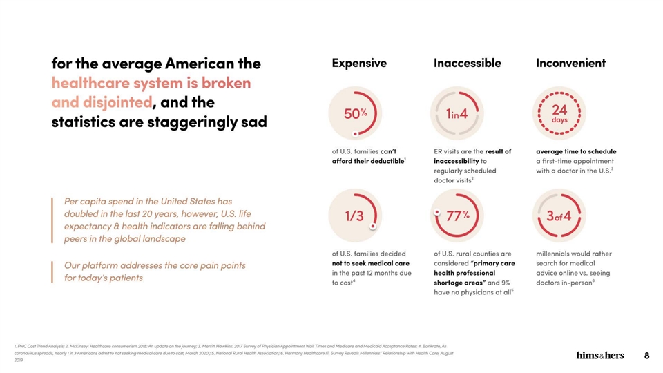 Expensive Inaccessible Inconvenient for the average American the healthcare system is broken ,- •, -··· and disjointed, and the .-:\ : 24 ~ lm4 • • ' days 1 statistics are staggeringly sad ' , ·----- of U.S. families can't ER visits are the result of average time to schedule 1 afford their deductible inaccessibility to a first-time appointment 3 regularly scheduled with a doctor in the U.S. 2 doctor visits Per capita spend in the United States has doubled in the last 20 years, however, U.S. life expectancy a health indicators are falling behind peers in the global landscape of U.S. families decided of U.S. rural counties are millennia Is would rather not to seek medical care considered primary care search for medical Our platform addresses the core pain points in the past 12 months due health professional advice online vs. seeing for today's patients 4 6 to cost shortage areas and 9'ro doctors in-person 5 have no physicians at all 1. PwC Cost Trend Analysis; 2. McKinsey: Healthcare consumerism 2018: An update on the journey; 3. Merritt Hawkins: 2017 Survey of Physician Appointment Wait Times and Medicare and Medicaid Acceptance Rates; 4. Bankrate, As coronavirus spreads, nearly 1 in 3 Americans admit to not seeking medical care due to cost, March 2020; 5. National Rural Health Association; 6. Harmony Heafthcare IT, Survey Reveals Mi/fennials Relationship with Health Care, August hims&hers 8 2019 Expensive Inaccessible Inconvenient for the average American the healthcare system is broken ,- •, -··· and disjointed, and the .-:\ : 24 ~ lm4 • • ' days 1 statistics are staggeringly sad ' , ·----- of U.S. families can't ER visits are the result of average time to schedule 1 afford their deductible inaccessibility to a first-time appointment 3 regularly scheduled with a doctor in the U.S. 2 doctor visits Per capita spend in the United States has doubled in the last 20 years, however, U.S. life expectancy a health indicators are falling behind peers in the global landscape of U.S. families decided of U.S. rural counties are millennia Is would rather not to seek medical care considered primary care search for medical Our platform addresses the core pain points in the past 12 months due health professional advice online vs. seeing for today's patients 4 6 to cost shortage areas and 9'ro doctors in-person 5 have no physicians at all 1. PwC Cost Trend Analysis; 2. McKinsey: Healthcare consumerism 2018: An update on the journey; 3. Merritt Hawkins: 2017 Survey of Physician Appointment Wait Times and Medicare and Medicaid Acceptance Rates; 4. Bankrate, As coronavirus spreads, nearly 1 in 3 Americans admit to not seeking medical care due to cost, March 2020; 5. National Rural Health Association; 6. Harmony Heafthcare IT, Survey Reveals Mi/fennials Relationship with Health Care, August hims&hers 8 2019