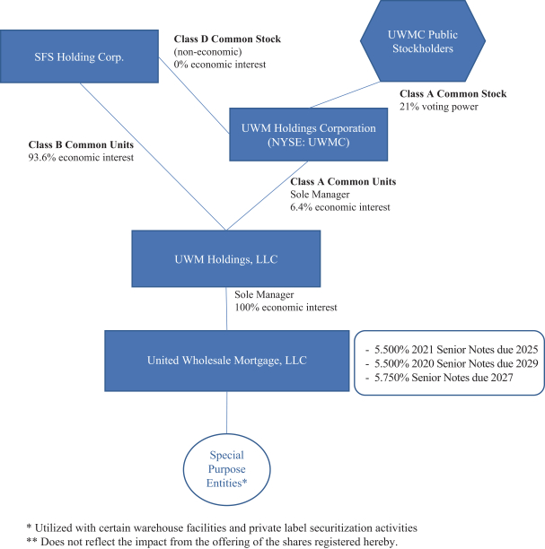 SFS Holding Corp. (the “”) is offering 50,000,000 shares of Class A common stock of UWM Holdings Corporation which are issuable upon exchange of the Class B Common Units in UWM Holdings LLC (the “”) and the stapled Class D common stock. We will not receive any proceeds from the sale of the shares of Class A common stock by the Selling Securityholder.