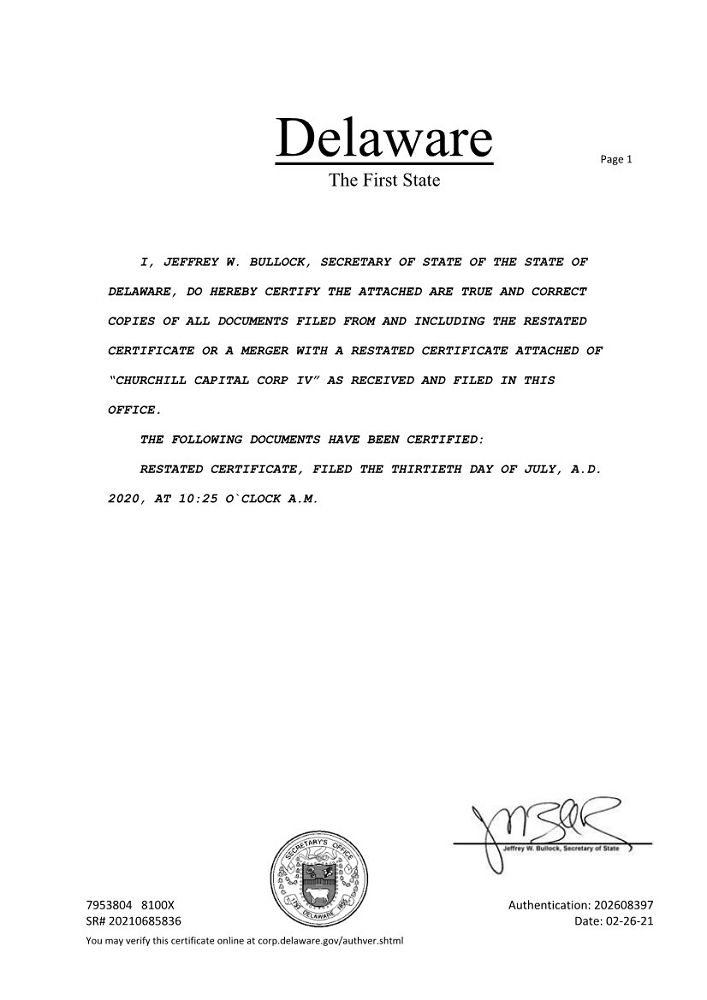 Delaware The First State Page 1 7953804 8100X Authentication: 202608397 SR# 20210685836 Date: 02-26-21 You may verify this certificate online at corp.delaware.gov/authver.shtml I, JEFFREY W. BULLOCK, SECRETARY OF STATE OF THE STATE OF DELAWARE, DO HEREBY CERTIFY THE ATTACHED ARE TRUE AND CORRECT COPIES OF ALL DOCUMENTS FILED FROM AND INCLUDING THE RESTATED CERTIFICATE OR A MERGER WITH A RESTATED CERTIFICATE ATTACHED OF “CHURCHILL CAPITAL CORP IV” AS RECEIVED AND FILED IN THIS OFFICE. THE FOLLOWING DOCUMENTS HAVE BEEN CERTIFIED: RESTATED CERTIFICATE, FILED THE THIRTIETH DAY OF JULY, A.D. 2020, AT 10:25 O`CLOCK A.M. |