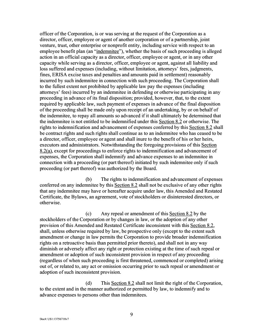 officer of the Corporation, is or was serving at the request of the Corporation as a director, officer, employee or agent of another corporation or of a partnership, joint venture, trust, other enterprise or nonprofit entity, including service with respect to an employee benefit plan (an "indemnitee"), whether the basis of such proceeding is alleged action in an official capacity as a director, officer, employee or agent, or in any other capacity while serving as a director, officer, employee or agent, against all liability and loss suffered and expenses (including, without limitation, attorneys' fees, judgments, fines, ERISA excise taxes and penalties and amounts paid in settlement) reasonably incurred by such indemnitee in connection with such proceeding. The Corporation shall to the fullest extent not prohibited by applicable law pay the expenses (including attorneys' fees) incurred by an indemnitee in defending or otherwise participating in any proceeding in advance of its final disposition; provided, however, that, to the extent required by applicable law, such payment of expenses in advance of the final disposition of the proceeding shall be made only upon receipt of an undertaking, by or on behalf of the indemnitee, to repay all amounts so advanced if it shall ultimately be determined that the indemnitee is not entitled to be indemnified under this Section 8.2 or otherwise. The rights to indemnification and advancement of expenses conferred by this Section 8.2 shall be contract rights and such rights shall continue as to an indemnitee who has ceased to be a director, officer, employee or agent and shall inure to the benefit of his or her heirs, executors and administrators. Notwithstanding the foregoing provisions of this Section 8.2(a), except for proceedings to enforce rights to indemnification and advancement of expenses, the Corporation shall indemnify and advance expenses to an indemnitee in connection with a proceeding (or part thereof) initiated by such indemnitee only if such proceeding (or part thereof) was authorized by the Board. The rights to indemnification and advancement of expenses conferred on any indemnitee by this Section 8.2 shall not be exclusive of any other rights that any indemnitee may have or hereafter acquire under law, this Amended and Restated Certificate, the Bylaws, an agreement, vote of stockholders or disinterested directors, or otherwise. Any repeal or amendment of this Section 8.2 by the stockholders of the Corporation or by changes in law, or the adoption of any other provision of this Amended and Restated Certificate inconsistent with this Section 8.2, shall, unless otherwise required by law, be prospective only (except to the extent such amendment or change in law permits the Corporation to provide broader indemnification rights on a retroactive basis than permitted prior thereto), and shall not in any way diminish or adversely affect any right or protection existing at the time of such repeal or amendment or adoption of such inconsistent provision in respect of any proceeding (regardless of when such proceeding is first threatened, commenced or completed) arising out of, or related to, any act or omission occurring prior to such repeal or amendment or adoption of such inconsistent provision. This Section 8.2 shall not limit the right of the Corporation, to the extent and in the manner authorized or permitted by law, to indemnify and to advance expenses to persons other than indemnitees. 9 Dad,: US I :13756718v7
