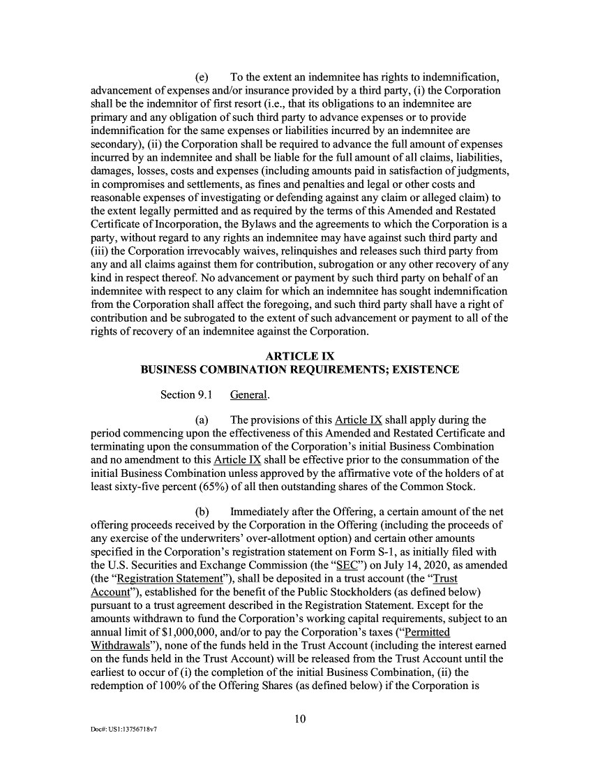 (e) To the extent an indemnitee has rights to indemnification, advancement of expenses and/or insurance provided by a third party, (i) the Corporation shall be the indemnitor of first resort (i.e., that its obligations to an indemnitee are primary and any obligation of such third party to advance expenses or to provide indemnification for the same expenses or liabilities incurred by an indemnitee are secondary), (ii) the Corporation shall be required to advance the full amount of expenses incurred by an indemnitee and shall be liable for the full amount of all claims, liabilities, damages, losses, costs and expenses (including amounts paid in satisfaction of judgments, in compromises and settlements, as fines and penalties and legal or other costs and reasonable expenses of investigating or defending against any claim or alleged claim) to the extent legally permitted and as required by the terms of this Amended and Restated Certificate of Incorporation, the Bylaws and the agreements to which the Corporation is a party, without regard to any rights an indemnitee may have against such third party and (iii) the Corporation irrevocably waives, relinquishes and releases such third party from any and all claims against them for contribution, subrogation or any other recovery of any kind in respect thereof. No advancement or payment by such third party on behalf of an indemnitee with respect to any claim for which an indemnitee has sought indemnification from the Corporation shall affect the foregoing, and such third party shall have a right of contribution and be subrogated to the extent of such advancement or payment to all of the rights of recovery of an indemnitee against the Corporation. ARTICLE IX BUSINESS COMBINATION REQUIREMENTS; EXISTENCE Section 9.1 General. The provisions of this Article IX shall apply during the period commencing upon the effectiveness of this Amended and Restated Certificate and terminating upon the consummation of the Corporation's initial Business Combination and no amendment to this Article IX shall be effective prior to the consummation of the initial Business Combination unless approved by the affirmative vote of the holders of at least sixty-five percent (65%) of all then outstanding shares of the Common Stock. Immediately after the Offering, a certain amount of the net offering proceeds received by the Corporation in the Offering (including the proceeds of any exercise of the underwriters' over-allotment option) and certain other amounts specified in the Corporation's registration statement on Form S-1, as initially filed with the U.S. Securities and Exchange Commission (the "SEC") on July 14, 2020, as amended (the "Registration Statement"), shall be deposited in a trust account (the "Trust Account"), established for the benefit of the Public Stockholders (as defined below) pursuant to a trust agreement described in the Registration Statement. Except for the amounts withdrawn to fund the Corporation's working capital requirements, subject to an annual limit of $1,000,000, and/or to pay the Corporation's taxes ("Permitted Withdrawals"), none of the funds held in the Trust Account (including the interest earned on the funds held in the Trust Account) will be released from the Trust Account until the earliest to occur of (i) the completion of the initial Business Combination, (ii) the redemption of 100% of the Offering Shares (as defined below) if the Corporation is 10 Doc,: USI:13756713v7