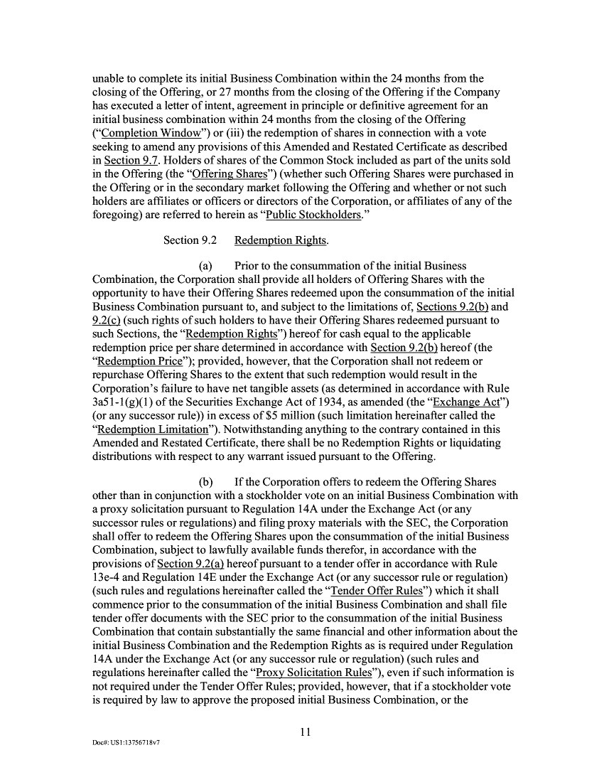unable to complete its initial Business Combination within the 24 months from the closing of the Offering, or 27 months from the closing of the Offering if the Company has executed a letter of intent, agreement in principle or definitive agreement for an initial business combination within 24 months from the closing of the Offering ("Completion Window") or (iii) the redemption of shares in connection with a vote seeking to amend any provisions of this Amended and Restated Certificate as described in Section 9.7. Holders of shares of the Common Stock included as part of the units sold in the Offering (the "Offering Shares") (whether such Offering Shares were purchased in the Offering or in the secondary market following the Offering and whether or not such holders are affiliates or officers or directors of the Corporation, or affiliates of any of the foregoing) are referred to herein as "Public Stockholders." Section 9.2 Redemption Rights. Prior to the consummation of the initial Business Combination, the Corporation shall provide all holders of Offering Shares with the opportunity to have their Offering Shares redeemed upon the consummation of the initial Business Combination pursuant to, and subject to the limitations of, Sections 9.2(b) and 9.2(c) (such rights of such holders to have their Offering Shares redeemed pursuant to such Sections, the "Redemption Rights") hereof for cash equal to the applicable redemption price per share determined in accordance with Section 9.2(b) hereof (the "Redemption Price"); provided, however, that the Corporation shall not redeem or repurchase Offering Shares to the extent that such redemption would result in the Corporation's failure to have net tangible assets (as determined in accordance with Rule 3a51-1(g)(1) of the Securities Exchange Act of 1934, as amended (the "Exchange Act") (or any successor rule)) in excess of $5 million (such limitation hereinafter called the "Redemption Limitation"). Notwithstanding anything to the contrary contained in this Amended and Restated Certificate, there shall be no Redemption Rights or liquidating distributions with respect to any warrant issued pursuant to the Offering. If the Corporation offers to redeem the Offering Shares other than in conjunction with a stockholder vote on an initial Business Combination with a proxy solicitation pursuant to Regulation 14A under the Exchange Act (or any successor rules or regulations) and filing proxy materials with the SEC, the Corporation shall offer to redeem the Offering Shares upon the consummation of the initial Business Combination, subject to lawfully available funds therefor, in accordance with the provisions of Section 9.2(a) hereof pursuant to a tender offer in accordance with Rule 13e-4 and Regulation 14E under the Exchange Act (or any successor rule or regulation) (such rules and regulations hereinafter called the "Tender Offer Rules") which it shall commence prior to the consummation of the initial Business Combination and shall file tender offer documents with the SEC prior to the consummation of the initial Business Combination that contain substantially the same financial and other information about the initial Business Combination and the Redemption Rights as is required under Regulation 14A under the Exchange Act (or any successor rule or regulation) (such rules and regulations hereinafter called the "Proxy Solicitation Rules"), even if such information is not required under the Tender Offer Rules; provided, however, that if a stockholder vote is required by law to approve the proposed initial Business Combination, or the 11 Doc#: US1:13756718v7