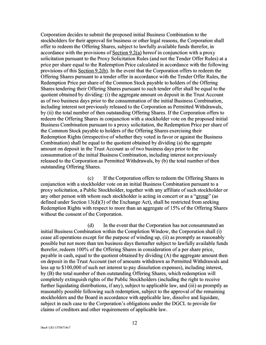 Corporation decides to submit the proposed initial Business Combination to the stockholders for their approval for business or other legal reasons, the Corporation shall offer to redeem the Offering Shares, subject to lawfully available funds therefor, in accordance with the provisions of Section 9.2(a) hereof in conjunction with a proxy solicitation pursuant to the Proxy Solicitation Rules (and not the Tender Offer Rules) at a price per share equal to the Redemption Price calculated in accordance with the following provisions of this Section 9.2(b). In the event that the Corporation offers to redeem the Offering Shares pursuant to a tender offer in accordance with the Tender Offer Rules, the Redemption Price per share of the Common Stock payable to holders of the Offering Shares tendering their Offering Shares pursuant to such tender offer shall be equal to the quotient obtained by dividing: (i) the aggregate amount on deposit in the Trust Account as of two business days prior to the consummation of the initial Business Combination, including interest not previously released to the Corporation as Permitted Withdrawals, by (ii) the total number of then outstanding Offering Shares. If the Corporation offers to redeem the Offering Shares in conjunction with a stockholder vote on the proposed initial Business Combination pursuant to a proxy solicitation, the Redemption Price per share of the Common Stock payable to holders of the Offering Shares exercising their Redemption Rights (irrespective of whether they voted in favor or against the Business Combination) shall be equal to the quotient obtained by dividing (a) the aggregate amount on deposit in the Trust Account as of two business days prior to the consummation of the initial Business Combination, including interest not previously released to the Corporation as Permitted Withdrawals, by (b) the total number of then outstanding Offering Shares. If the Corporation offers to redeem the Offering Shares in conjunction with a stockholder vote on an initial Business Combination pursuant to a proxy solicitation, a Public Stockholder, together with any affiliate of such stockholder or any other person with whom such stockholder is acting in concert or as a "group" (as defined under Section 13(d)(3) of the Exchange Act), shall be restricted from seeking Redemption Rights with respect to more than an aggregate of 15% of the Offering Shares without the consent of the Corporation. In the event that the Corporation has not consummated an initial Business Combination within the Completion Window, the Corporation shall (i) cease all operations except for the purpose of winding up, (ii) as promptly as reasonably possible but not more than ten business days thereafter subject to lawfully available funds therefor, redeem 100% of the Offering Shares in consideration of a per share price, payable in cash, equal to the quotient obtained by dividing (A) the aggregate amount then on deposit in the Trust Account (net of amounts withdrawn as Permitted Withdrawals and less up to $100,000 of such net interest to pay dissolution expenses), including interest, by (B) the total number of then outstanding Offering Shares, which redemption will completely extinguish rights of the Public Stockholders (including the right to receive further liquidating distributions, if any), subject to applicable law, and (iii) as promptly as reasonably possible following such redemption, subject to the approval of the remaining stockholders and the Board in accordance with applicable law, dissolve and liquidate, subject in each case to the Corporation's obligations under the DGCL to provide for claims of creditors and other requirements of applicable law. 12 Doc#: US I :13756718v7