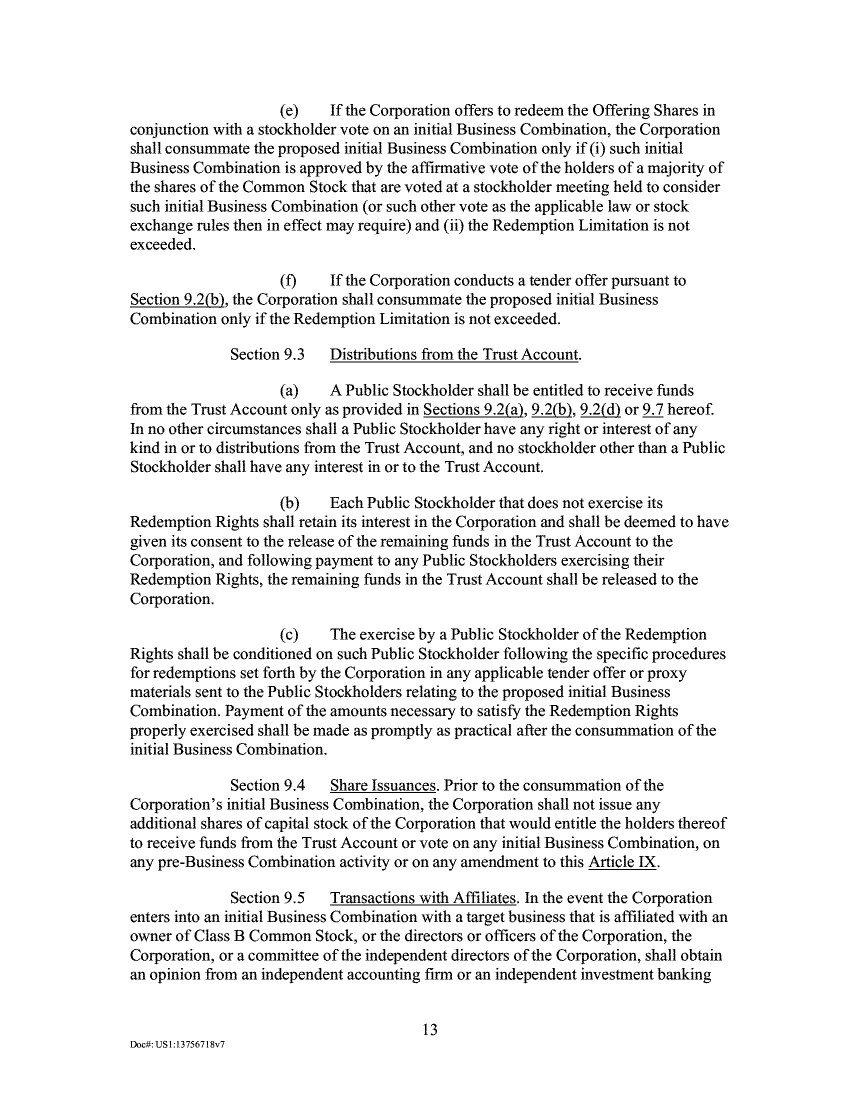 (e) If the Corporation offers to redeem the Offering Shares in conjunction with a stockholder vote on an initial Business Combination, the Corporation shall consummate the proposed initial Business Combination only if (i) such initial Business Combination is approved by the affirmative vote of the holders of a majority of the shares of the Common Stock that are voted at a stockholder meeting held to consider such initial Business Combination (or such other vote as the applicable law or stock exchange rules then in effect may require) and (ii) the Redemption Limitation is not exceeded. If the Corporation conducts a tender offer pursuant to Section 9.2(bl, the Corporation shall consummate the proposed initial Business Combination only if the Redemption Limitation is not exceeded. Section 9.3 Distributions from the Trust Account. A Public Stockholder shall be entitled to receive funds from the Trust Account only as provided in Sections 9.2(a), 9.2(b), 9.2(d) or 9.7 hereof. In no other circumstances shall a Public Stockholder have any right or interest of any kind in or to distributions from the Trust Account, and no stockholder other than a Public Stockholder shall have any interest in or to the Trust Account. Each Public Stockholder that does not exercise its Redemption Rights shall retain its interest in the Corporation and shall be deemed to have given its consent to the release of the remaining funds in the Trust Account to the Corporation, and following payment to any Public Stockholders exercising their Redemption Rights, the remaining funds in the Trust Account shall be released to the Corporation. The exercise by a Public Stockholder of the Redemption Rights shall be conditioned on such Public Stockholder following the specific procedures for redemptions set forth by the Corporation in any applicable tender offer or proxy materials sent to the Public Stockholders relating to the proposed initial Business Combination. Payment of the amounts necessary to satisfy the Redemption Rights properly exercised shall be made as promptly as practical after the consummation of the initial Business Combination. Section 9.4 Share Issuances. Prior to the consummation of the Corporation's initial Business Combination, the Corporation shall not issue any additional shares of capital stock of the Corporation that would entitle the holders thereof to receive funds from the Trust Account or vote on any initial Business Combination, on any pre-Business Combination activity or on any amendment to this Article IX. Section 9.5 Transactions with Affiliates. In the event the Corporation enters into an initial Business Combination with a target business that is affiliated with an owner of Class B Common Stock, or the directors or officers of the Corporation, the Corporation, or a committee of the independent directors of the Corporation, shall obtain an opinion from an independent accounting firm or an independent investment banking 13 Dock USI:13756718v7