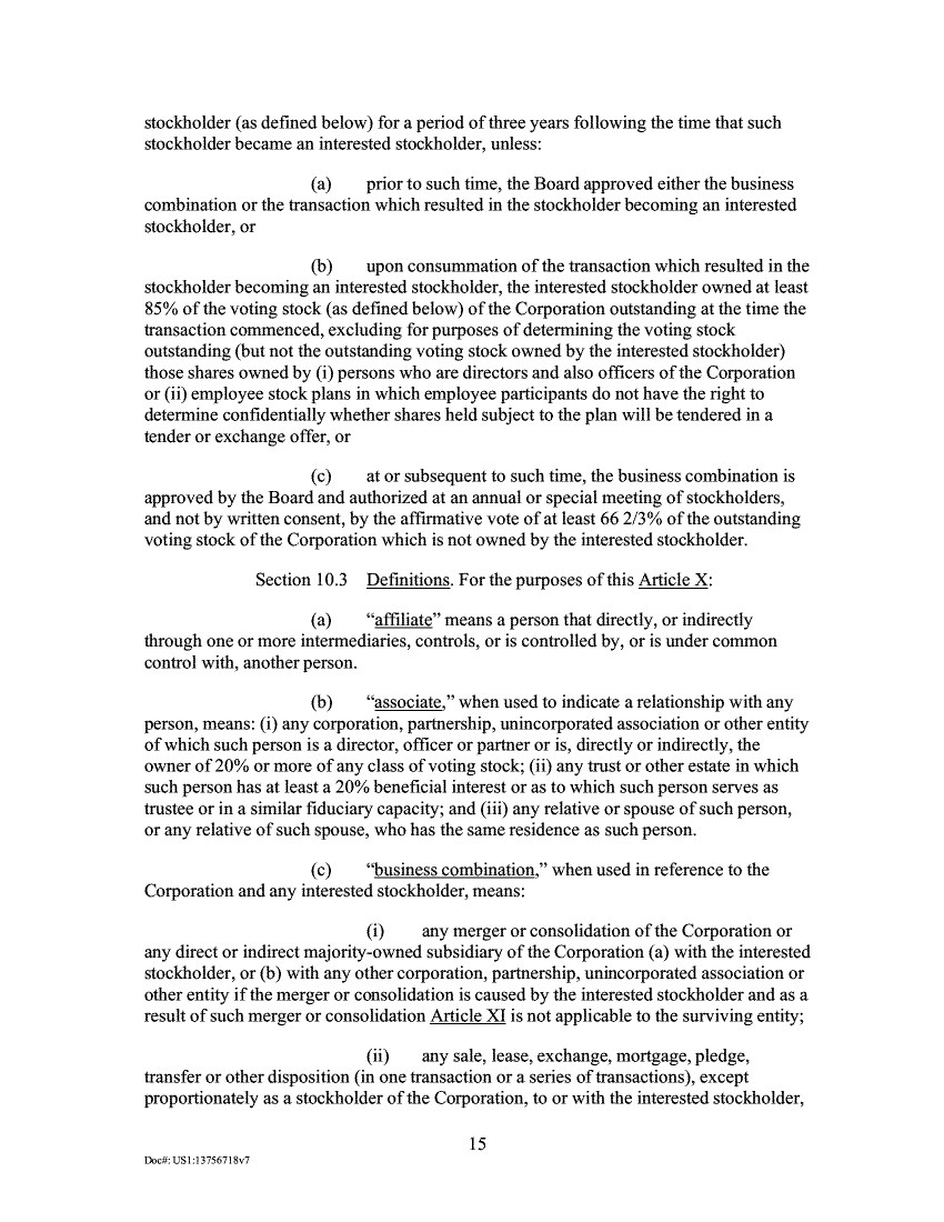 stockholder (as defined below) for a period of three years following the time that such stockholder became an interested stockholder, unless: prior to such time, the Board approved either the business combination or the transaction which resulted in the stockholder becoming an interested stockholder, or upon consummation of the transaction which resulted in the stockholder becoming an interested stockholder, the interested stockholder owned at least 85% of the voting stock (as defined below) of the Corporation outstanding at the time the transaction commenced, excluding for purposes of determining the voting stock outstanding (but not the outstanding voting stock owned by the interested stockholder) those shares owned by (i) persons who are directors and also officers of the Corporation or (ii) employee stock plans in which employee participants do not have the right to determine confidentially whether shares held subject to the plan will be tendered in a tender or exchange offer, or at or subsequent to such time, the business combination is approved by the Board and authorized at an annual or special meeting of stockholders, and not by written consent, by the affirmative vote of at least 66 2/3% of the outstanding voting stock of the Corporation which is not owned by the interested stockholder. Section 10.3 Definitions. For the purposes of this Article X: "affiliate" means a person that directly, or indirectly through one or more intermediaries, controls, or is controlled by, or is under common control with, another person. "associate," when used to indicate a relationship with any person, means: (i) any corporation, partnership, unincorporated association or other entity of which such person is a director, officer or partner or is, directly or indirectly, the owner of 20% or more of any class of voting stock; (ii) any trust or other estate in which such person has at least a 20% beneficial interest or as to which such person serves as trustee or in a similar fiduciary capacity; and (iii) any relative or spouse of such person, or any relative of such spouse, who has the same residence as such person. "business combination," when used in reference to the Corporation and any interested stockholder, means: any merger or consolidation of the Corporation or any direct or indirect majority-owned subsidiary of the Corporation (a) with the interested stockholder, or (b) with any other corporation, partnership, unincorporated association or other entity if the merger or consolidation is caused by the interested stockholder and as a result of such merger or consolidation Article XI is not applicable to the surviving entity; any sale, lease, exchange, mortgage, pledge, transfer or other disposition (in one transaction or a series of transactions), except proportionately as a stockholder of the Corporation, to or with the interested stockholder, 15 DodkUS1:13756718v7