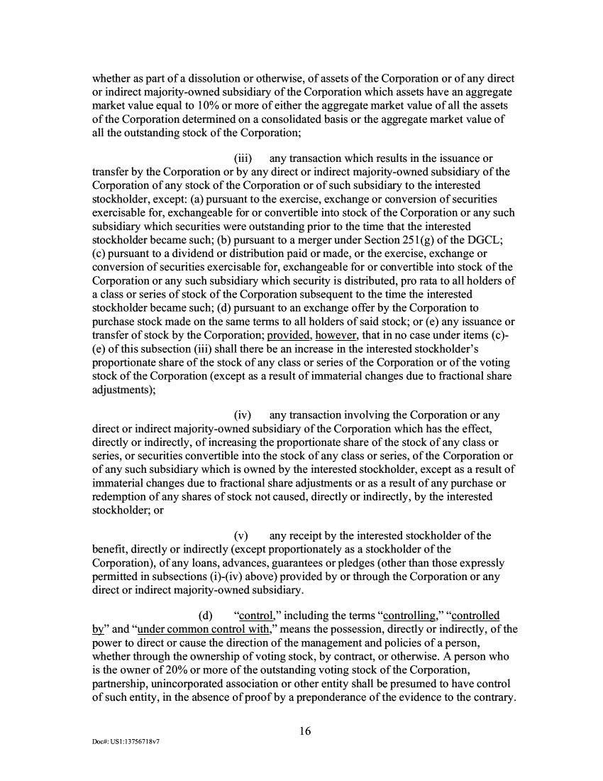 whether as part of a dissolution or otherwise, of assets of the Corporation or of any direct or indirect majority-owned subsidiary of the Corporation which assets have an aggregate market value equal to 10% or more of either the aggregate market value of all the assets of the Corporation determined on a consolidated basis or the aggregate market value of all the outstanding stock of the Corporation; any transaction which results in the issuance or transfer by the Corporation or by any direct or indirect majority-owned subsidiary of the Corporation of any stock of the Corporation or of such subsidiary to the interested stockholder, except: (a) pursuant to the exercise, exchange or conversion of securities exercisable for, exchangeable for or convertible into stock of the Corporation or any such subsidiary which securities were outstanding prior to the time that the interested stockholder became such; (b) pursuant to a merger under Section 251(g) of the DGCL; (c) pursuant to a dividend or distribution paid or made, or the exercise, exchange or conversion of securities exercisable for, exchangeable for or convertible into stock of the Corporation or any such subsidiary which security is distributed, pro rata to all holders of a class or series of stock of the Corporation subsequent to the time the interested stockholder became such; (d) pursuant to an exchange offer by the Corporation to purchase stock made on the same terms to all holders of said stock; or (e) any issuance or transfer of stock by the Corporation; provided, however, that in no case under items (c)-(e) of this subsection (iii) shall there be an increase in the interested stockholder's proportionate share of the stock of any class or series of the Corporation or of the voting stock of the Corporation (except as a result of immaterial changes due to fractional share adjustments); any transaction involving the Corporation or any direct or indirect majority-owned subsidiary of the Corporation which has the effect, directly or indirectly, of increasing the proportionate share of the stock of any class or series, or securities convertible into the stock of any class or series, of the Corporation or of any such subsidiary which is owned by the interested stockholder, except as a result of immaterial changes due to fractional share adjustments or as a result of any purchase or redemption of any shares of stock not caused, directly or indirectly, by the interested stockholder; or any receipt by the interested stockholder of the benefit, directly or indirectly (except proportionately as a stockholder of the Corporation), of any loans, advances, guarantees or pledges (other than those expressly permitted in subsections (i)-(iv) above) provided by or through the Corporation or any direct or indirect majority-owned subsidiary. (d) "control," including the terms "controlling," "controlled by" and "under common control with," means the possession, directly or indirectly, of the power to direct or cause the direction of the management and policies of a person, whether through the ownership of voting stock, by contract, or otherwise. A person who is the owner of 20% or more of the outstanding voting stock of the Corporation, partnership, unincorporated association or other entity shall be presumed to have control of such entity, in the absence of proof by a preponderance of the evidence to the contrary. 16 DocO:USI:13756718v7