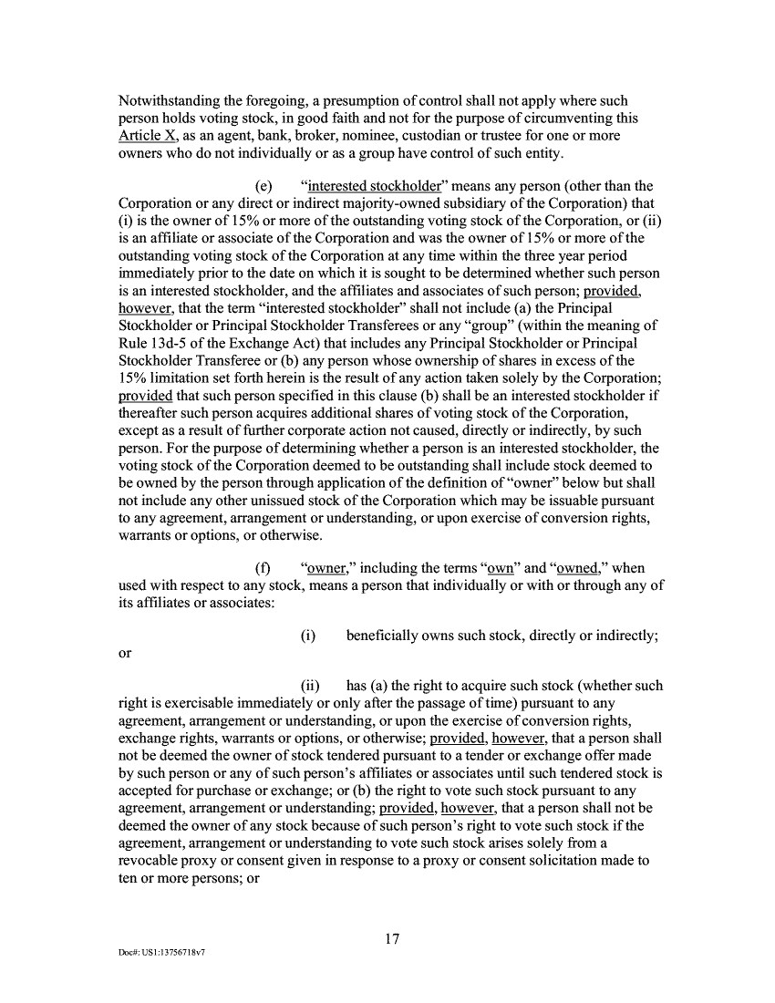 Notwithstanding the foregoing, a presumption of control shall not apply where such person holds voting stock, in good faith and not for the purpose of circumventing this Article X, as an agent, bank, broker, nominee, custodian or trustee for one or more owners who do not individually or as a group have control of such entity. "interested stockholder" means any person (other than the Corporation or any direct or indirect majority-owned subsidiary of the Corporation) that (i) is the owner of 15% or more of the outstanding voting stock of the Corporation, or (ii) is an affiliate or associate of the Corporation and was the owner of 15% or more of the outstanding voting stock of the Corporation at any time within the three year period immediately prior to the date on which it is sought to be determined whether such person is an interested stockholder, and the affiliates and associates of such person; provided, however, that the term "interested stockholder" shall not include (a) the Principal Stockholder or Principal Stockholder Transferees or any "group" (within the meaning of Rule 13d-5 of the Exchange Act) that includes any Principal Stockholder or Principal Stockholder Transferee or (b) any person whose ownership of shares in excess of the 15% limitation set forth herein is the result of any action taken solely by the Corporation; provided that such person specified in this clause (b) shall be an interested stockholder if thereafter such person acquires additional shares of voting stock of the Corporation, except as a result of further corporate action not caused, directly or indirectly, by such person. For the purpose of determining whether a person is an interested stockholder, the voting stock of the Corporation deemed to be outstanding shall include stock deemed to be owned by the person through application of the definition of "owner" below but shall not include any other unissued stock of the Corporation which may be issuable pursuant to any agreement, arrangement or understanding, or upon exercise of conversion rights, warrants or options, or otherwise. "owner," including the terms "own" and "owned," when used with respect to any stock, means a person that individually or with or through any of its affiliates or associates: beneficially owns such stock, directly or indirectly; or has (a) the right to acquire such stock (whether such right is exercisable immediately or only after the passage of time) pursuant to any agreement, arrangement or understanding, or upon the exercise of conversion rights, exchange rights, warrants or options, or otherwise; provided, however, that a person shall not be deemed the owner of stock tendered pursuant to a tender or exchange offer made by such person or any of such person's affiliates or associates until such tendered stock is accepted for purchase or exchange; or (b) the right to vote such stock pursuant to any agreement, arrangement or understanding; provided, however, that a person shall not be deemed the owner of any stock because of such person's right to vote such stock if the agreement, arrangement or understanding to vote such stock arises solely from a revocable proxy or consent given in response to a proxy or consent solicitation made to ten or more persons; or 17 DoctUS1:13756718v7
