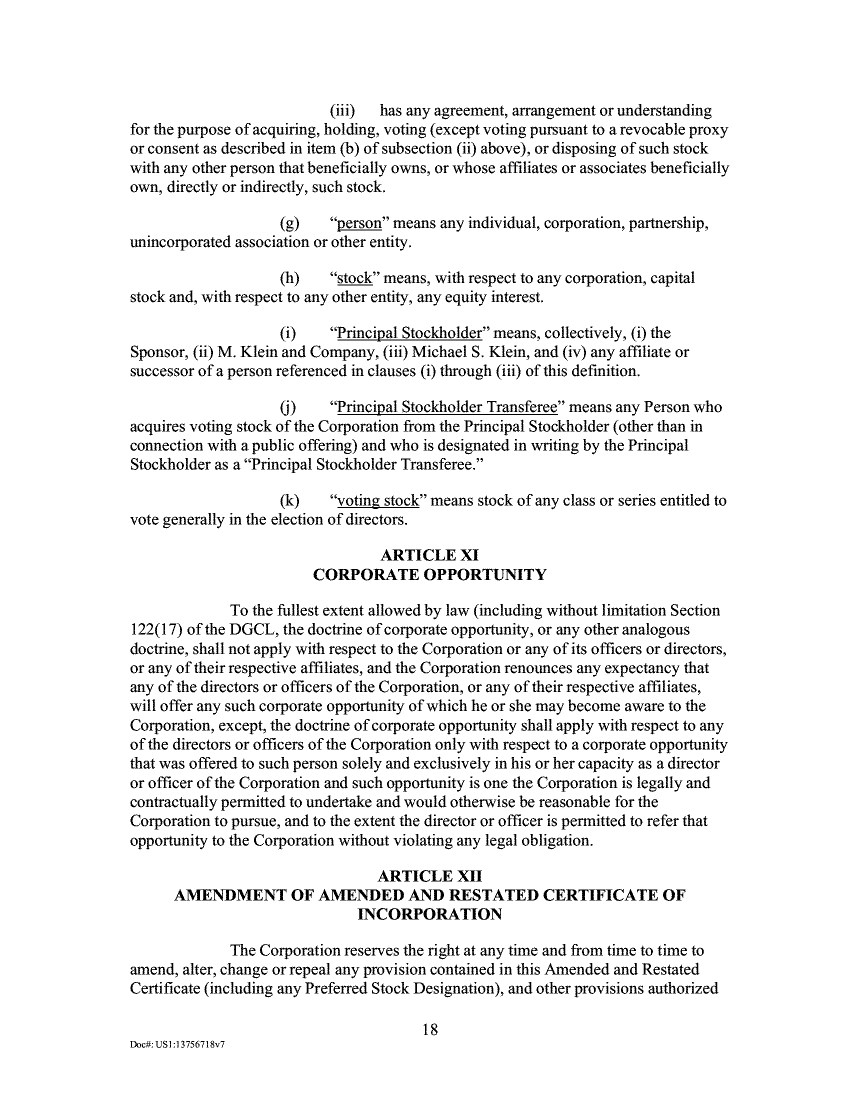 (iii) has any agreement, arrangement or understanding for the purpose of acquiring, holding, voting (except voting pursuant to a revocable proxy or consent as described in item (b) of subsection (ii) above), or disposing of such stock with any other person that beneficially owns, or whose affiliates or associates beneficially own, directly or indirectly, such stock. "person" means any individual, corporation, partnership, unincorporated association or other entity. "stock" means, with respect to any corporation, capital stock and, with respect to any other entity, any equity interest. "Principal Stockholder" means, collectively, (i) the Sponsor, (ii) M. Klein and Company, (iii) Michael S. Klein, and (iv) any affiliate or successor of a person referenced in clauses (i) through (iii) of this definition. "Principal Stockholder Transferee" means any Person who acquires voting stock of the Corporation from the Principal Stockholder (other than in connection with a public offering) and who is designated in writing by the Principal Stockholder as a "Principal Stockholder Transferee." "voting stock" means stock of any class or series entitled to vote generally in the election of directors. ARTICLE XI CORPORATE OPPORTUNITY To the fullest extent allowed by law (including without limitation Section 122(17) of the DGCL, the doctrine of corporate opportunity, or any other analogous doctrine, shall not apply with respect to the Corporation or any of its officers or directors, or any of their respective affiliates, and the Corporation renounces any expectancy that any of the directors or officers of the Corporation, or any of their respective affiliates, will offer any such corporate opportunity of which he or she may become aware to the Corporation, except, the doctrine of corporate opportunity shall apply with respect to any of the directors or officers of the Corporation only with respect to a corporate opportunity that was offered to such person solely and exclusively in his or her capacity as a director or officer of the Corporation and such opportunity is one the Corporation is legally and contractually permitted to undertake and would otherwise be reasonable for the Corporation to pursue, and to the extent the director or officer is permitted to refer that opportunity to the Corporation without violating any legal obligation. ARTICLE XII AMENDMENT OF AMENDED AND RESTATED CERTIFICATE OF INCORPORATION The Corporation reserves the right at any time and from time to time to amend, alter, change or repeal any provision contained in this Amended and Restated Certificate (including any Preferred Stock Designation), and other provisions authorized 18 Doc#: US1:13756718v7