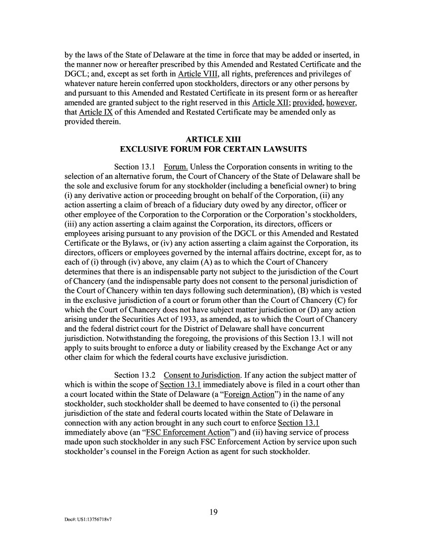 by the laws of the State of Delaware at the time in force that may be added or inserted, in the manner now or hereafter prescribed by this Amended and Restated Certificate and the DGCL; and, except as set forth in Article VIII, all rights, preferences and privileges of whatever nature herein conferred upon stockholders, directors or any other persons by and pursuant to this Amended and Restated Certificate in its present form or as hereafter amended are granted subject to the right reserved in this Article XII; provided, however, that Article IX of this Amended and Restated Certificate may be amended only as provided therein. ARTICLE XIII EXCLUSIVE FORUM FOR CERTAIN LAWSUITS Section 13.1 Forum. Unless the Corporation consents in writing to the selection of an alternative forum, the Court of Chancery of the State of Delaware shall be the sole and exclusive forum for any stockholder (including a beneficial owner) to bring (i) any derivative action or proceeding brought on behalf of the Corporation, (ii) any action asserting a claim of breach of a fiduciary duty owed by any director, officer or other employee of the Corporation to the Corporation or the Corporation's stockholders, (iii) any action asserting a claim against the Corporation, its directors, officers or employees arising pursuant to any provision of the DGCL or this Amended and Restated Certificate or the Bylaws, or (iv) any action asserting a claim against the Corporation, its directors, officers or employees governed by the internal affairs doctrine, except for, as to each of (i) through (iv) above, any claim (A) as to which the Court of Chancery determines that there is an indispensable party not subject to the jurisdiction of the Court of Chancery (and the indispensable party does not consent to the personal jurisdiction of the Court of Chancery within ten days following such determination), (B) which is vested in the exclusive jurisdiction of a court or forum other than the Court of Chancery (C) for which the Court of Chancery does not have subject matter jurisdiction or (D) any action arising under the Securities Act of 1933, as amended, as to which the Court of Chancery and the federal district court for the District of Delaware shall have concurrent jurisdiction. Notwithstanding the foregoing, the provisions of this Section 13.1 will not apply to suits brought to enforce a duty or liability creased by the Exchange Act or any other claim for which the federal courts have exclusive jurisdiction. Section 13.2 Consent to Jurisdiction. If any action the subject matter of which is within the scope of Section 13.1 immediately above is filed in a court other than a court located within the State of Delaware (a "Foreign Action") in the name of any stockholder, such stockholder shall be deemed to have consented to (i) the personal jurisdiction of the state and federal courts located within the State of Delaware in connection with any action brought in any such court to enforce Section 13.1 immediately above (an "FSC Enforcement Action") and (ii) having service of process made upon such stockholder in any such FSC Enforcement Action by service upon such stockholder's counsel in the Foreign Action as agent for such stockholder. 19 Docit:IJS1:13756718v7