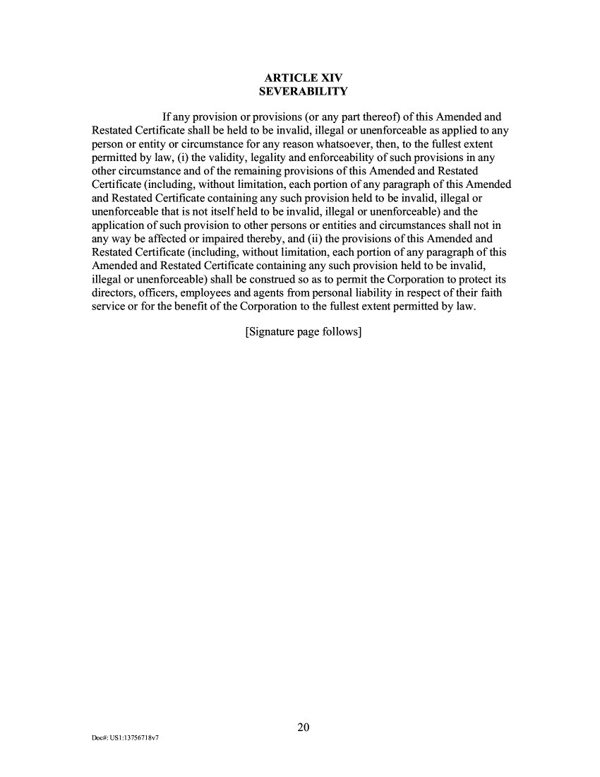ARTICLE XIV SEVERABILITY If any provision or provisions (or any part thereof) of this Amended and Restated Certificate shall be held to be invalid, illegal or unenforceable as applied to any person or entity or circumstance for any reason whatsoever, then, to the fullest extent permitted by law, (i) the validity, legality and enforceability of such provisions in any other circumstance and of the remaining provisions of this Amended and Restated Certificate (including, without limitation, each portion of any paragraph of this Amended and Restated Certificate containing any such provision held to be invalid, illegal or unenforceable that is not itself held to be invalid, illegal or unenforceable) and the application of such provision to other persons or entities and circumstances shall not in any way be affected or impaired thereby, and (ii) the provisions of this Amended and Restated Certificate (including, without limitation, each portion of any paragraph of this Amended and Restated Certificate containing any such provision held to be invalid, illegal or unenforceable) shall be construed so as to permit the Corporation to protect its directors, officers, employees and agents from personal liability in respect of their faith service or for the benefit of the Corporation to the fullest extent permitted by law. [Signature page follows]
