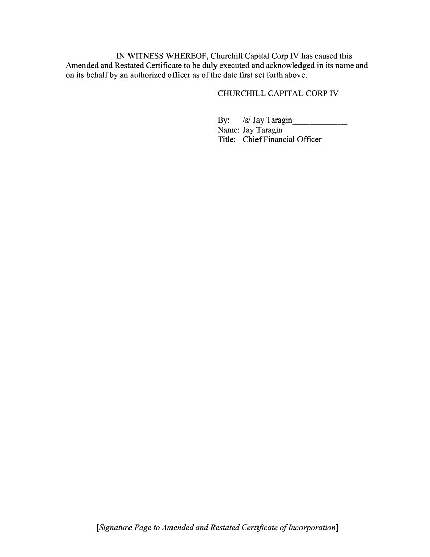 IN WITNESS WHEREOF, Churchill Capital Corp IV has caused this Amended and Restated Certificate to be duly executed and acknowledged in its name and on its behalf by an authorized officer as of the date first set forth above. CHURCHILL CAPITAL CORP IV By: /s/ Jay Taragin Name: Jay Taragin Title: Chief Financial Officer [Signature Page to Amended and Restated Certificate ofIncorporation]